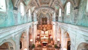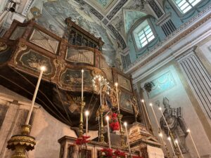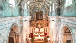 Proseguendo lungo la navata centrale, lo sguardo si posa sull’altare maggiore, il punto focale dell’intera chiesa. Questo spazio sacro rappresenta il fulcro delle celebrazioni liturgiche e un concentrato di arte e spiritualità. Sopra di esso, il coro si erge maestoso, ospitando un antico organo che amplifica l’atmosfera solenne dell’intero ambiente. Ma lo descriveremo nel dettaglio non appena giunti lì.