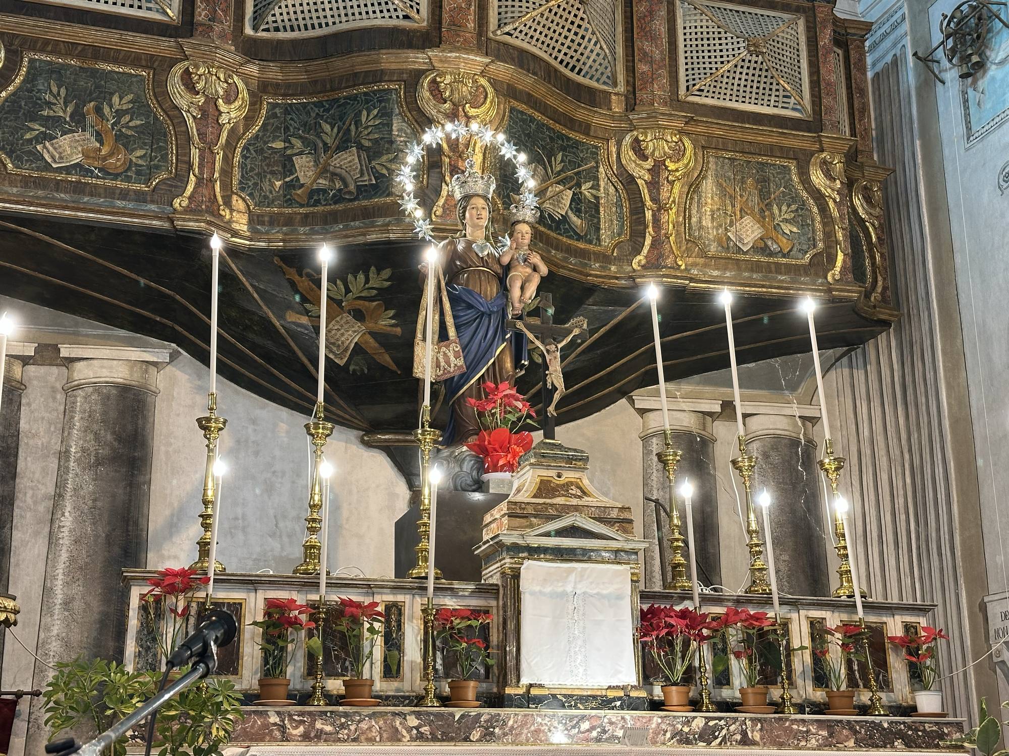 Al centro dell’altare maggiore è posta una statua lignea della Madonna del Carmelo. Questo simulacro raffigura la Vergine che regge con la mano destra lo scapolare sabatino, simbolo di protezione e redenzione e con la mano sinistra sorregge il bambino Gesù. La statua, caratterizzata da una delicatezza espressiva e un’attenzione ai dettagli dei panneggi, è un’opera che invita alla devozione. Intorno alla statua, elementi dorati e stucchi raffinati amplificano l’effetto di luce e sacralità. Sopra l’altare, un timpano spezzato ospita figure angeliche che sembrano sorvegliare e proteggere lo spazio sacro.