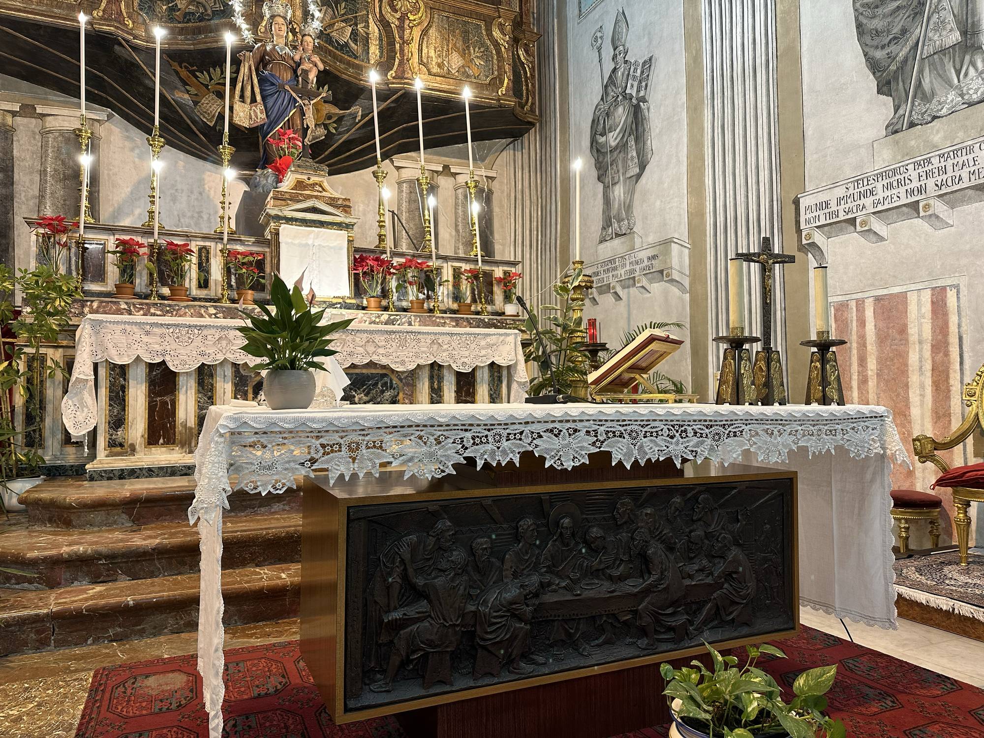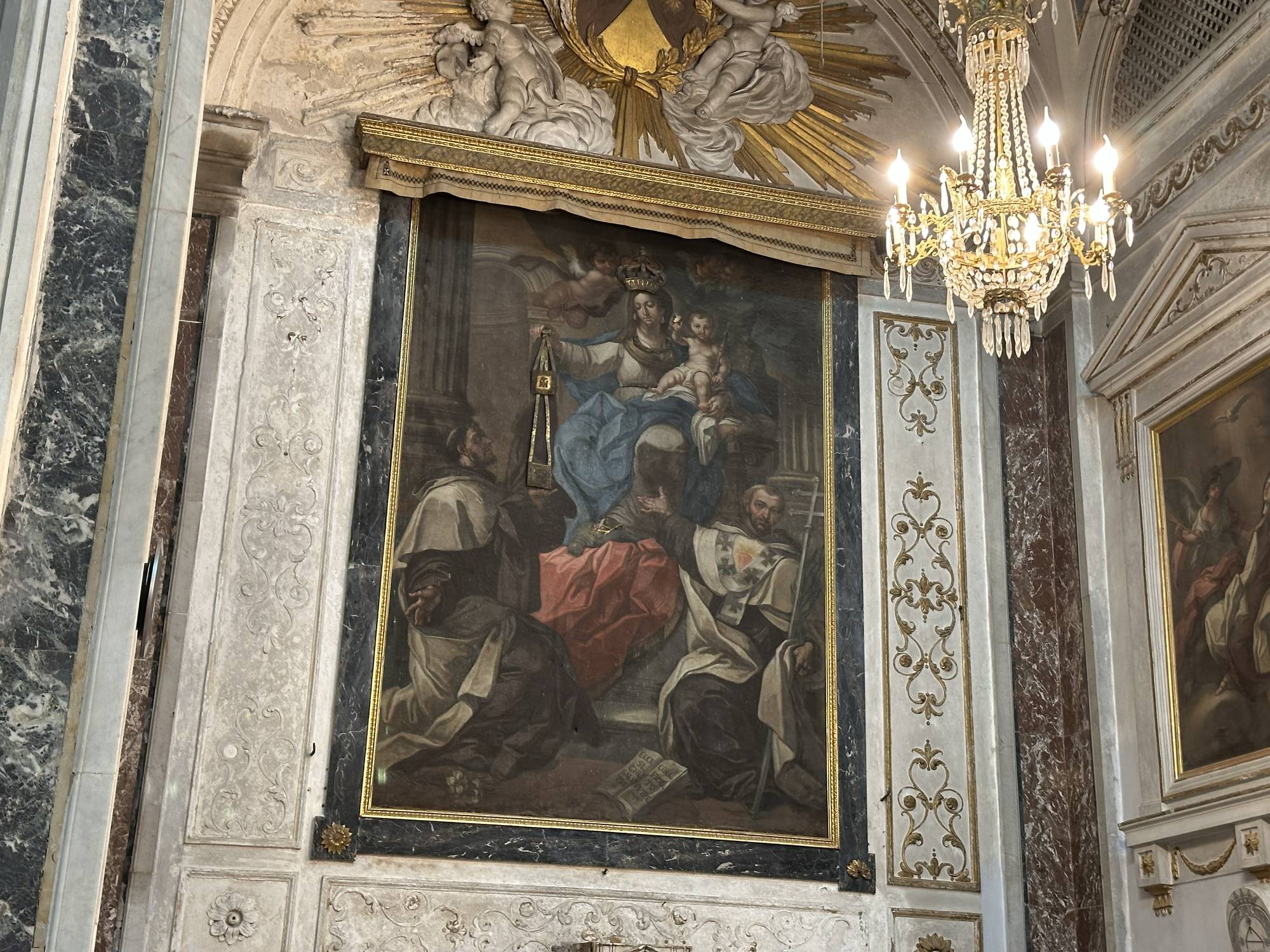 L’altare maggiore è un autentico gioiello di architettura sacra, realizzato in marmo policromo e decorato con dettagli raffinati che sottolineano la sua importanza.
