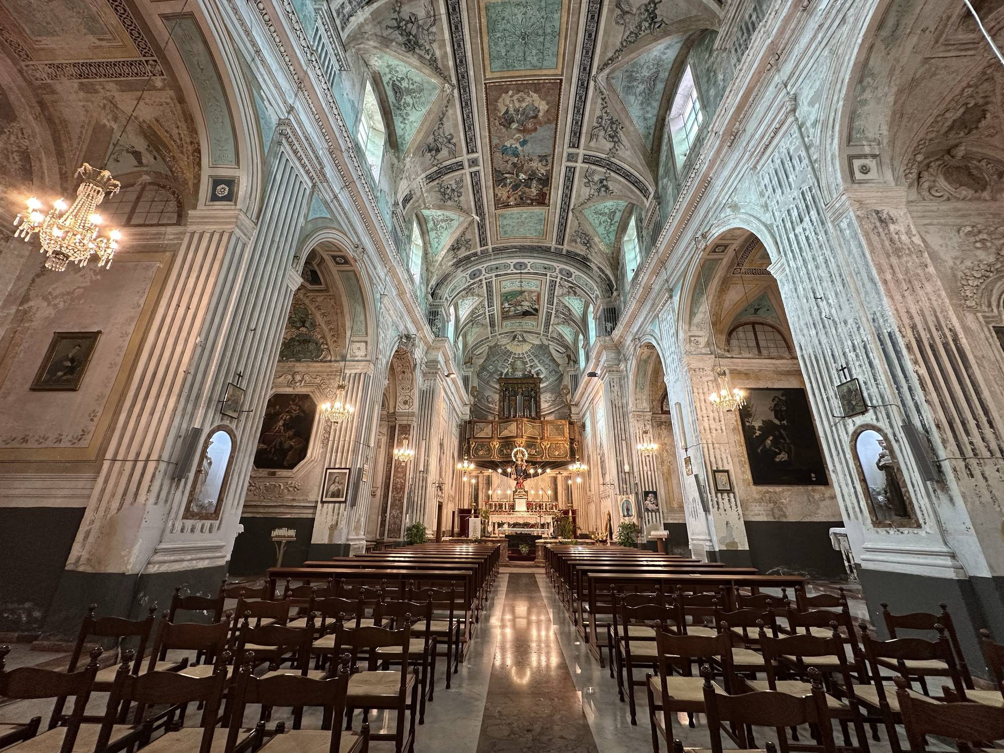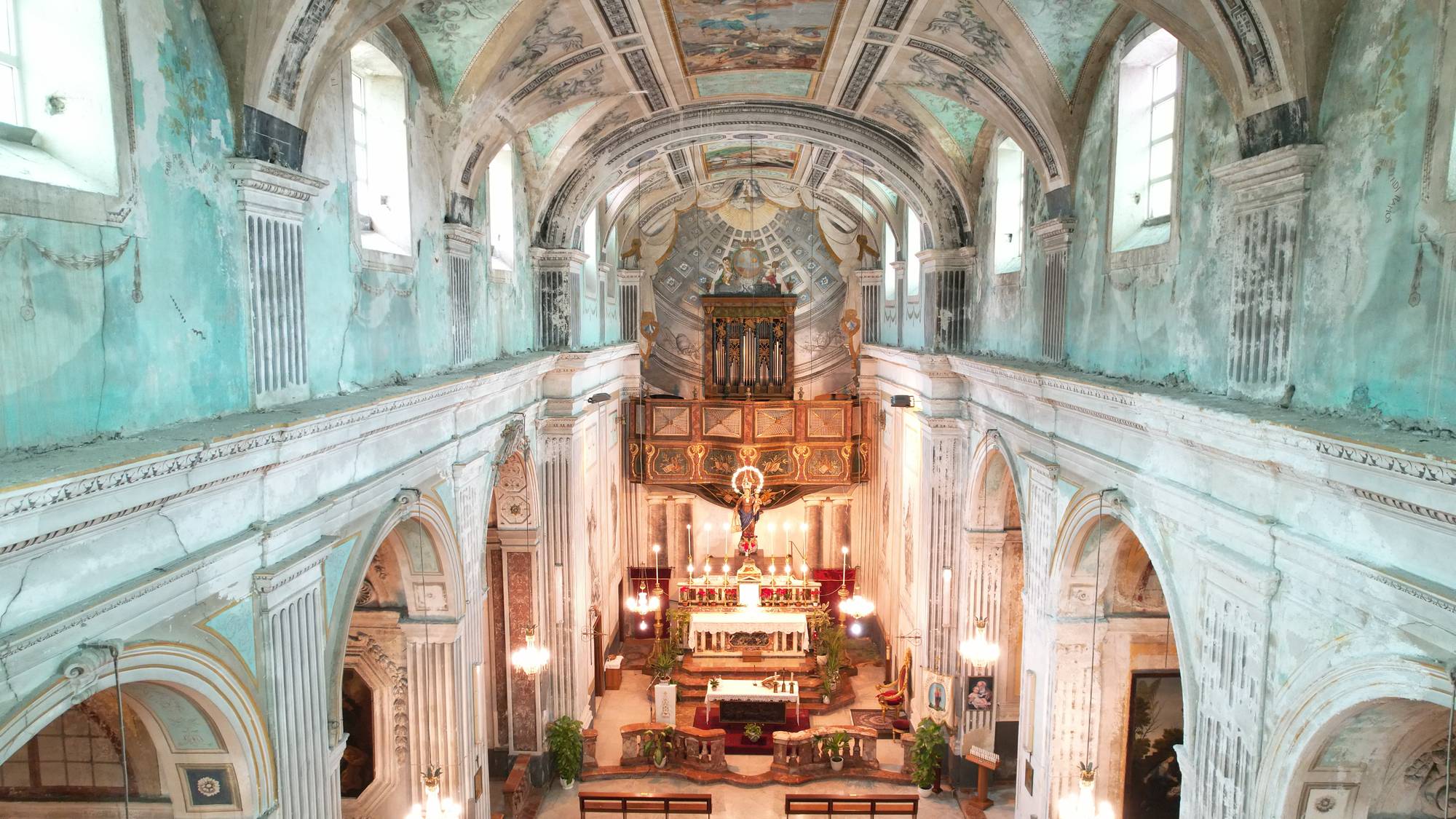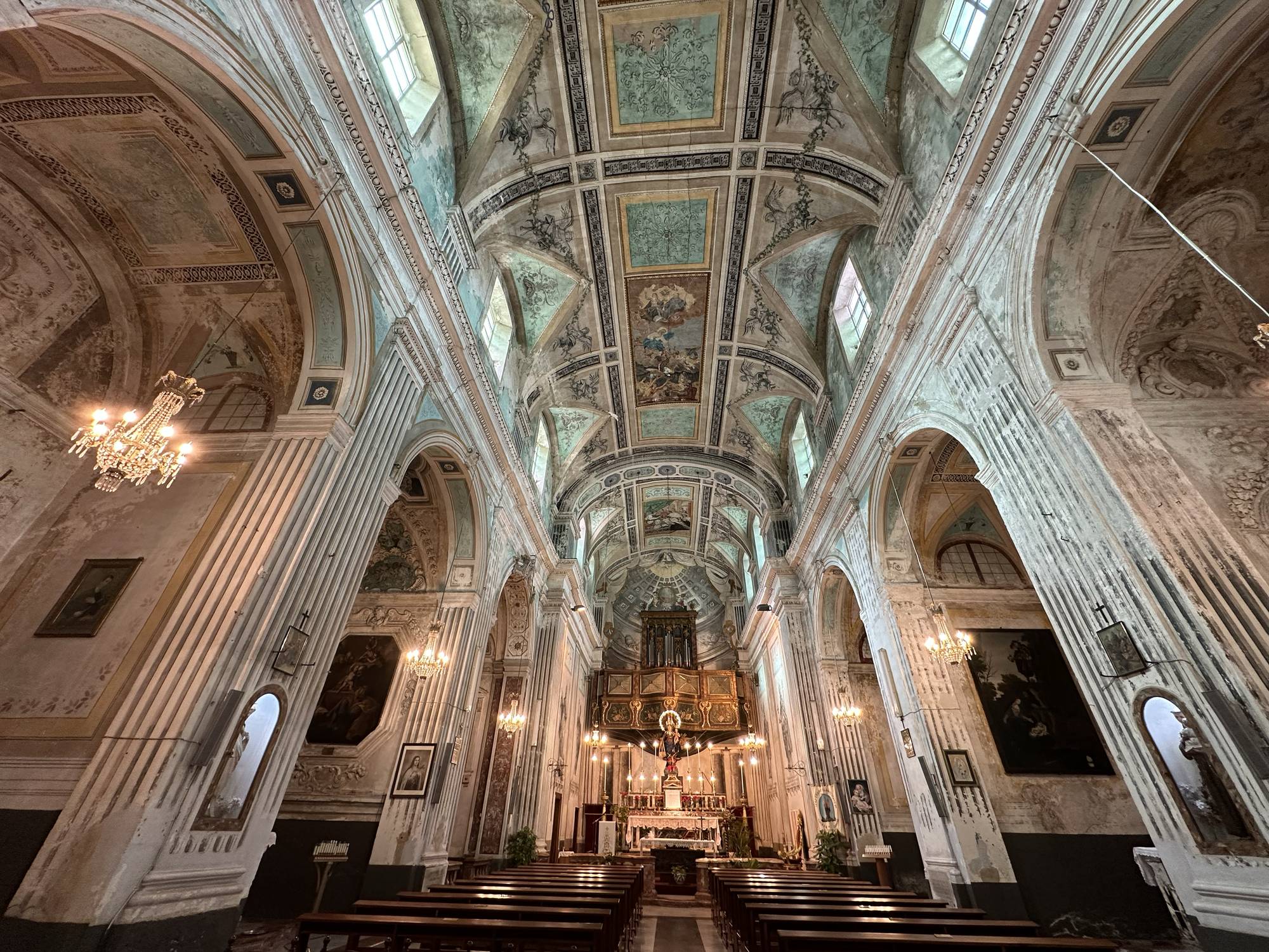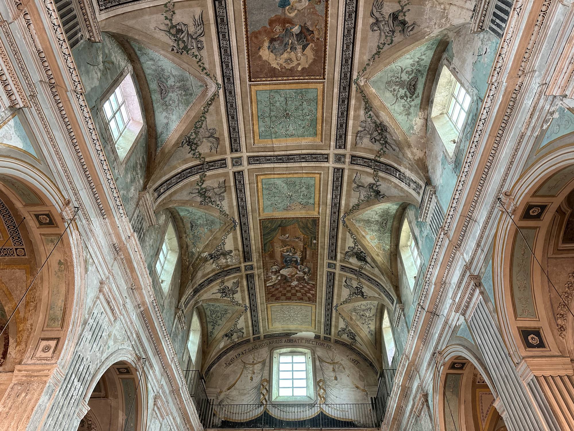 La volta a botte, recentemente restaurata, domina lo spazio. In origine era interamente decorata da rabeschi e figure monocromatiche dipinte da Giuseppe Brusca e dalla scuola di Vincenzo Blandino. Sebbene alcune di queste decorazioni siano andate perdute, i frammenti rimasti nelle pareti laterali e nel coro offrono un’idea della maestria degli artisti.