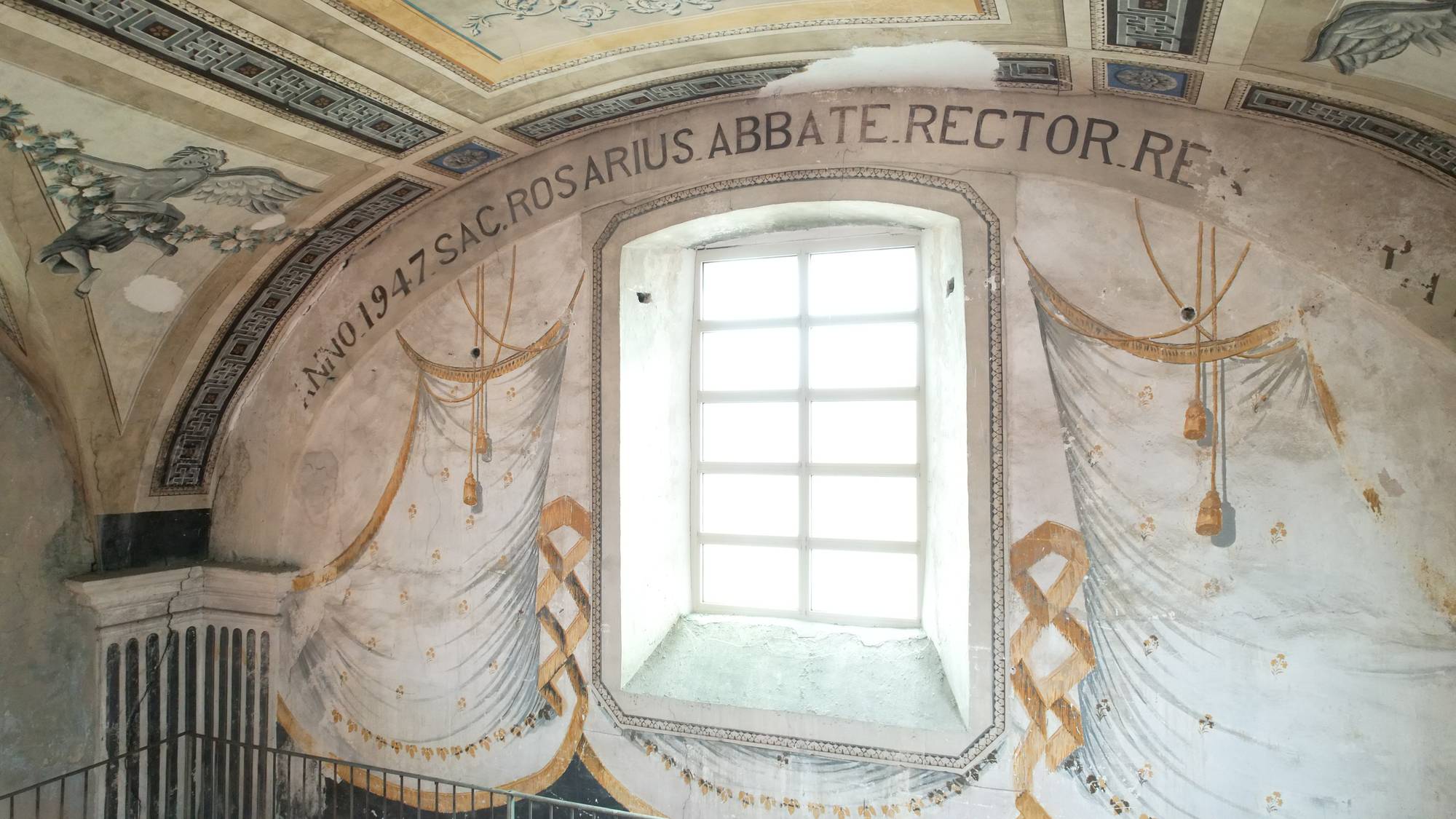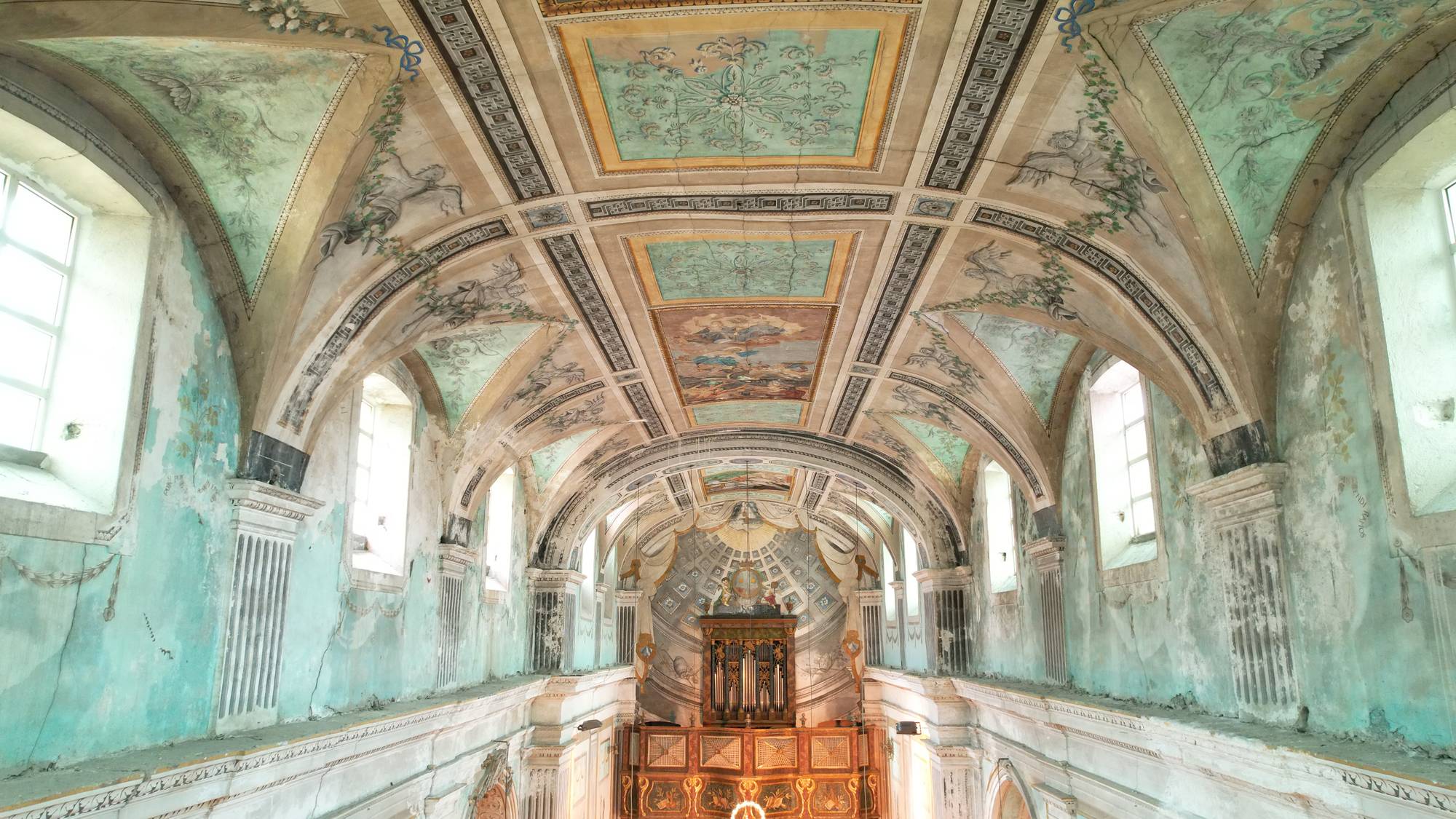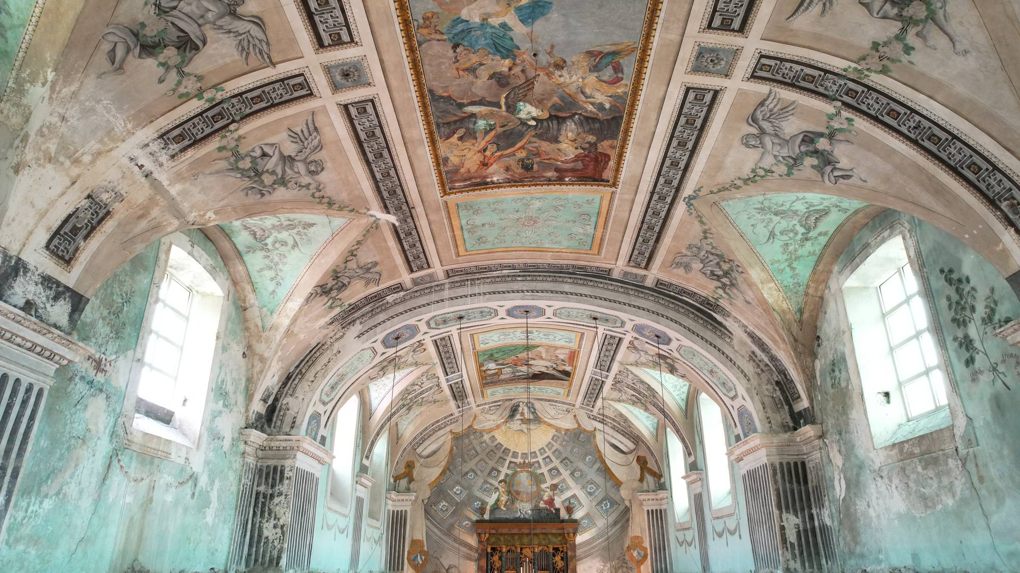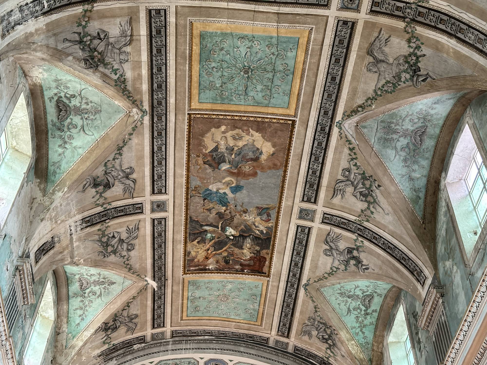 La volta a botte, recentemente restaurata, domina lo spazio. In origine era interamente decorata da rabeschi e figure monocromatiche dipinte da Giuseppe Brusca e dalla scuola di Vincenzo Blandino. Sebbene alcune di queste decorazioni siano andate perdute, i frammenti rimasti nelle pareti laterali e nel coro offrono un’idea della maestria degli artisti.