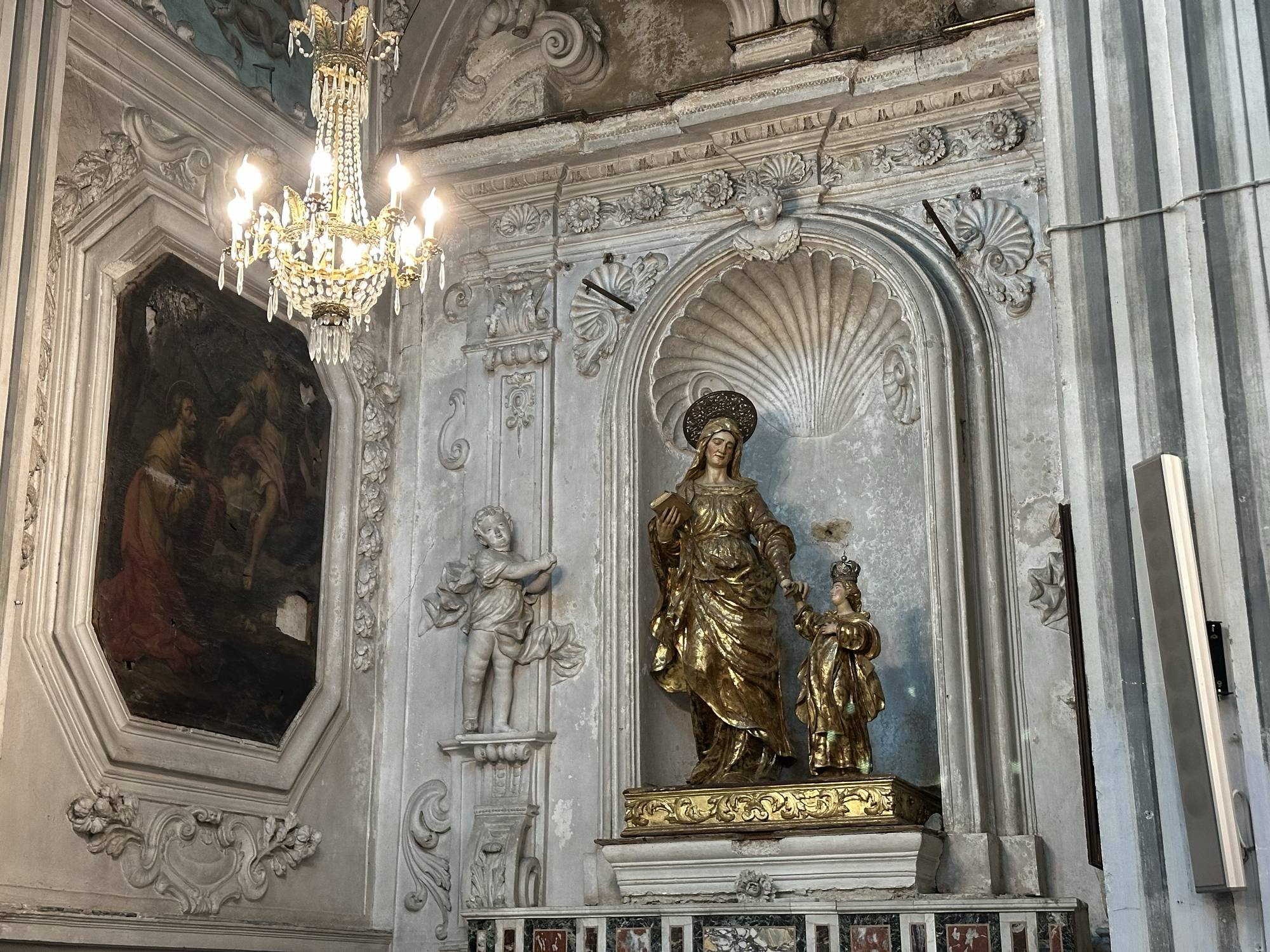 Adesso ti invito a porre lo sguardo lungo le pareti laterali della navata centrale della Chiesa del Carmine. Ai suoi lati si aprono otto cappelle, quattro per lato, ognuna dedicata a un santo o a una scena della tradizione cristiana. Queste cappelle rappresentano un percorso spirituale e artistico, dove ogni elemento, dai dipinti alle statue, dagli stucchi alle decorazioni racconta una storia di devozione e bellezza.