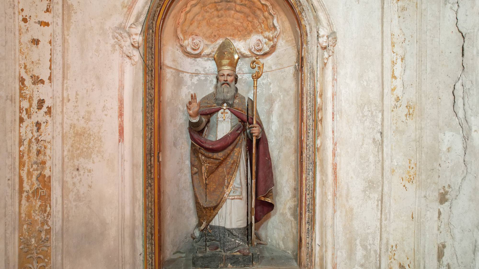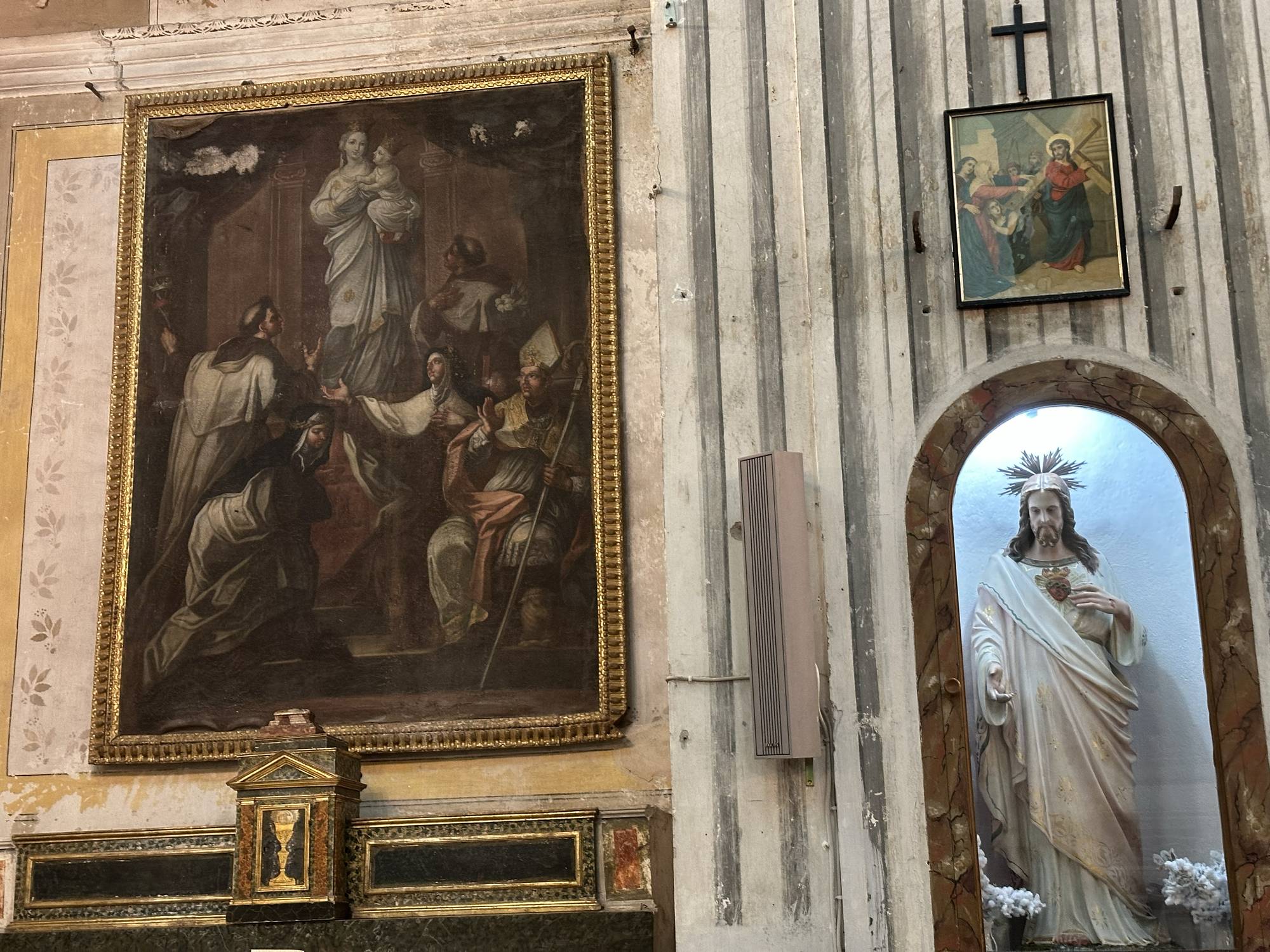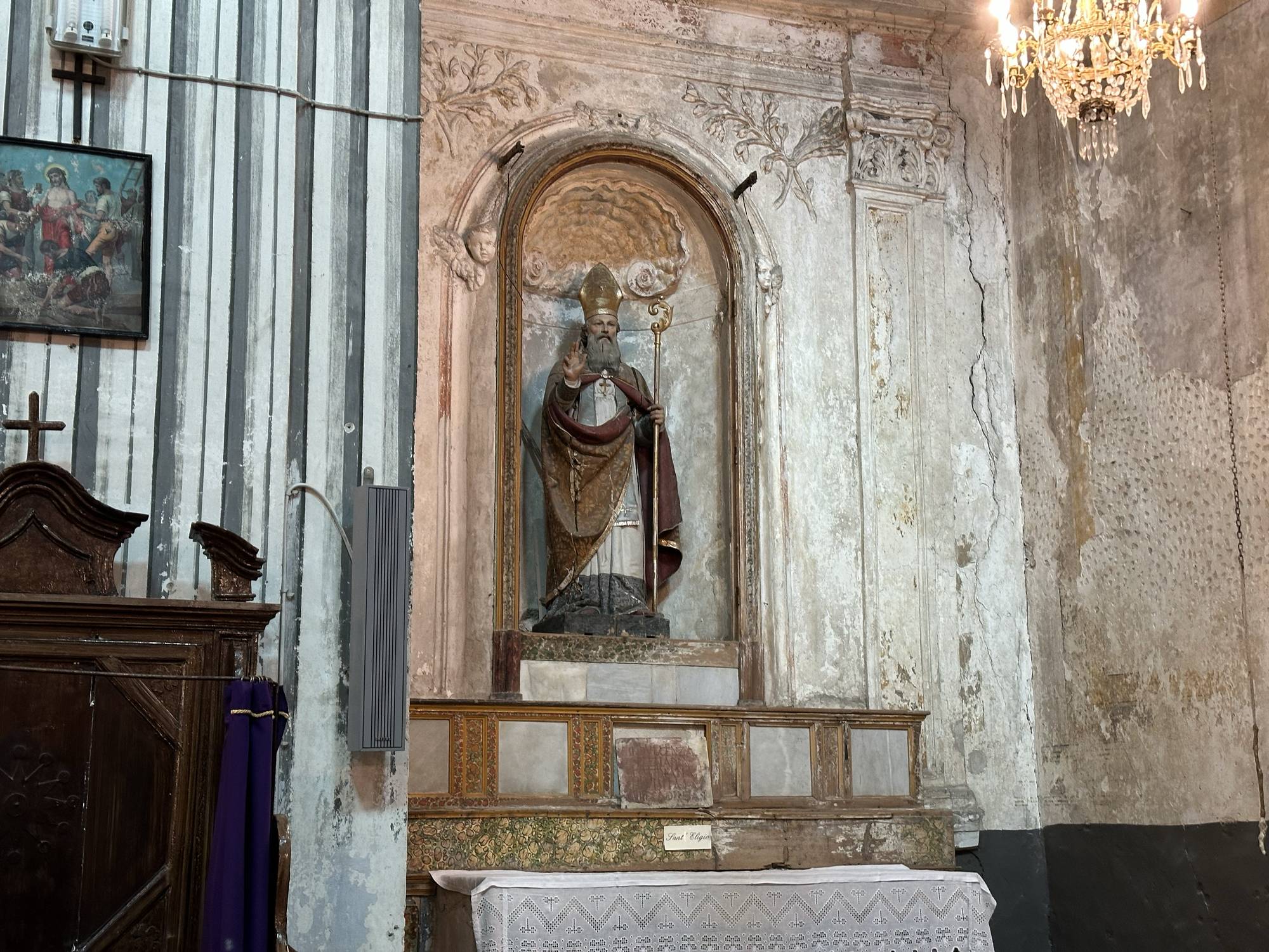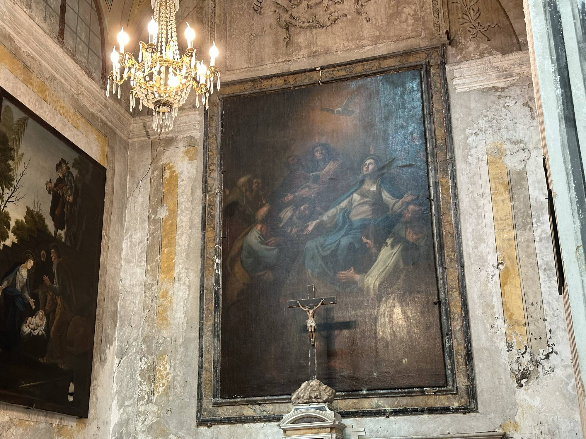 Sopra l’altare rivestito di intarsi marmorei, all’interno della nicchia affrescata con lo sfondo di un tendaggio morbido con elementi penduli dorati, si staglia la statua lignea di un Crocifisso di autore ignoto databile al milleseicento.