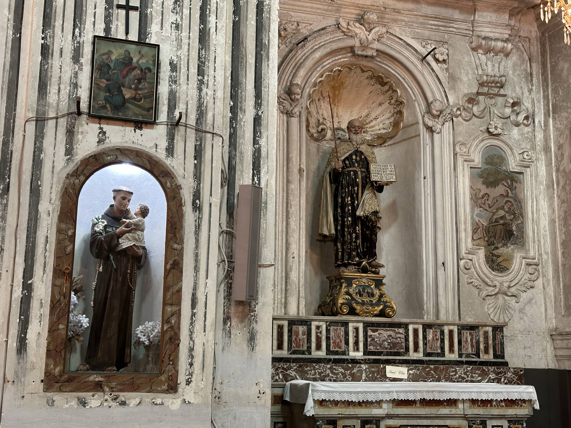 La Terza Cappella a Destra è dedicata a San Elia, il profeta considerato uno dei fondatori spirituali dell’Ordine Carmelitano. La Statua rappresenta Sant’Elia in un momento di contemplazione, con il libro delle Scritture aperto, San Elia trasmette un senso di forza spirituale. La statua è scolpita in legno e dipinta con colori vivaci. Gli elementi iconografici, come il carro di fuoco e il manto profetico, sottolineano il ruolo di San Elia nella tradizione cristiana.