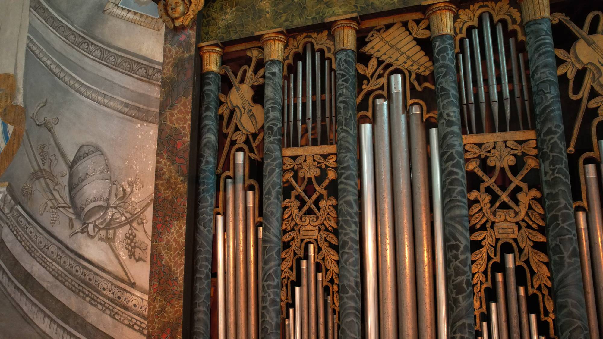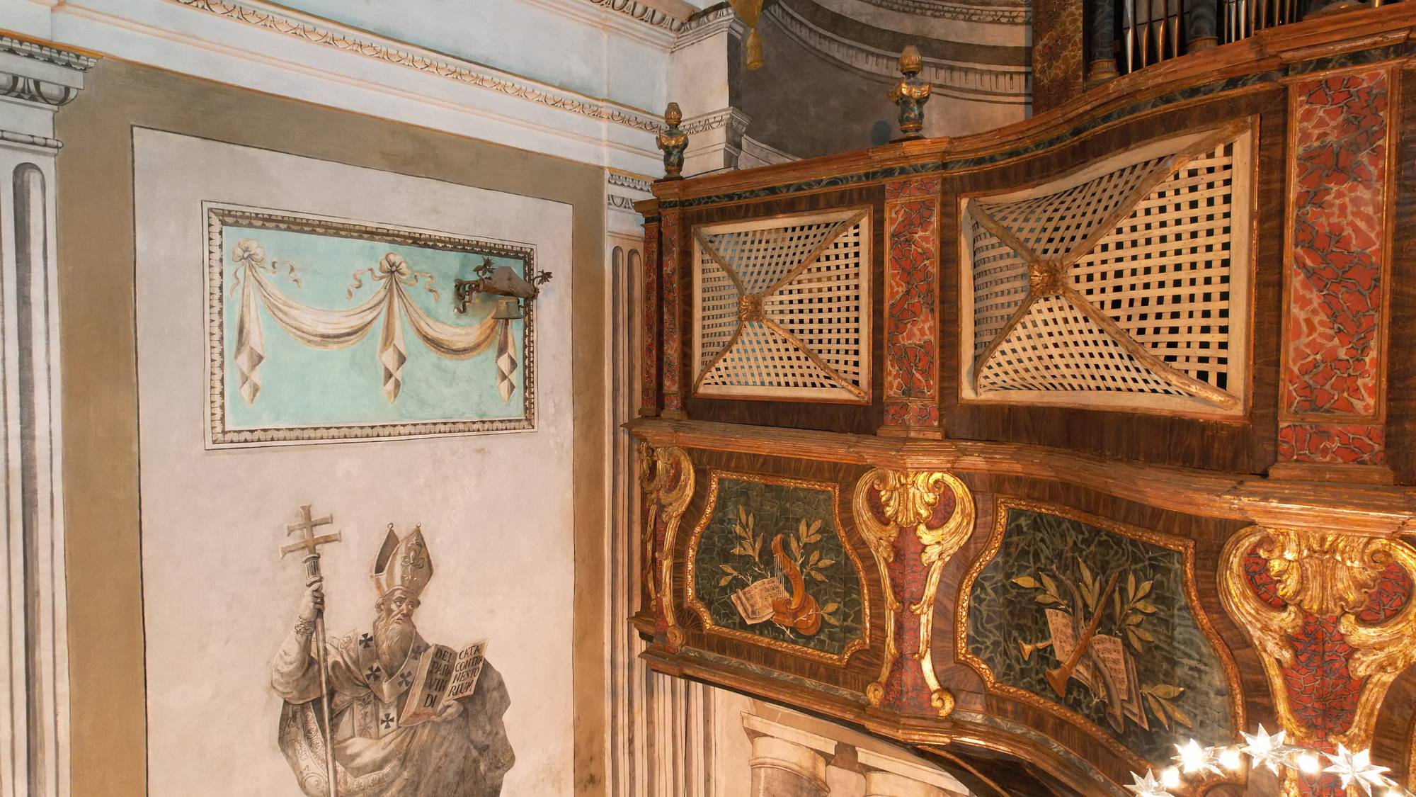 Volgendo lo sguardo verso l’alto, dietro l’altare maggiore, la magnificenza del coro si staglia sulla parete. Un luogo concepito per il canto liturgico e la meditazione spirituale. L’organo, realizzato da La Grassa, è un capolavoro di artigianato tardo-barocco. Le canne dell’organo, disposte in modo simmetrico, si innalzano verso l’alto, creando un effetto visivo di grande imponenza. La cassa lignea che ricopre il piano del coro su cui è posto l’organo fa anche da parapetto dove si innestano le grate realizzate secondo lo stile dei matronei. Tutta la struttura, realizzata in legno intagliato e dorato, decorata con motivi floreali e angeli musicanti, a sottolineare la funzione musicale dello spazio, sembra sorretta dalle quattro colonne in stile dorico che sono affrescate sulla parete di fondo.