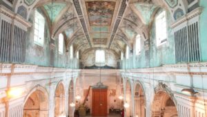 La pianta rettangolare della navata centrale guida lo sguardo verso l’altare maggiore, creando un forte senso di profondità.