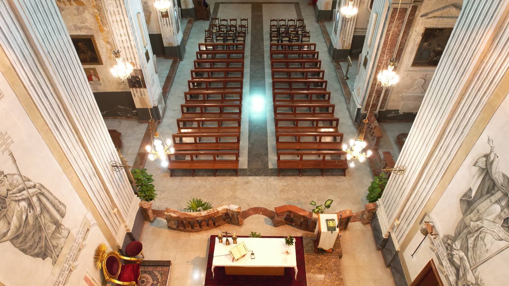 Le pareti dell’altare maggiore sono decorate con affreschi monocromatici, attribuiti a Giuseppe Brusca, realizzati con la tecnica della grisaille seicentesca attraverso pigmenti a base di carbone e calce che imitano il rilievo scultoreo. Questi dipinti, caratterizzati da un chiaroscuro drammatico e da un sobrio ma espressivo gioco di luci e ombre, raffigurano figure di prelati e santi carmelitani, immerse in composizioni dinamiche con linee diagonali e gesti teatrali tipici del Barocco. Le figure, rese con precisione anatomica e panneggi elaborati, sembrano emergere dall’intonaco grazie a sfumature di grigio che accentuano volume e profondità, mentre l’assenza del colore, oltre a creare un’atmosfera di raccoglimento austero, potrebbe alludere a un simbolismo spirituale legato alla Controriforma.
