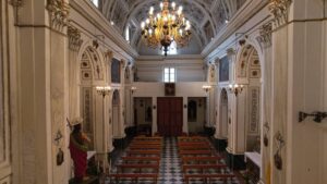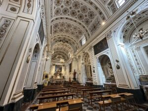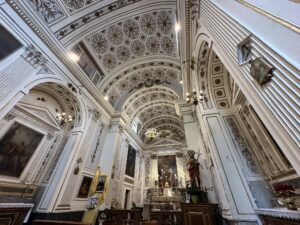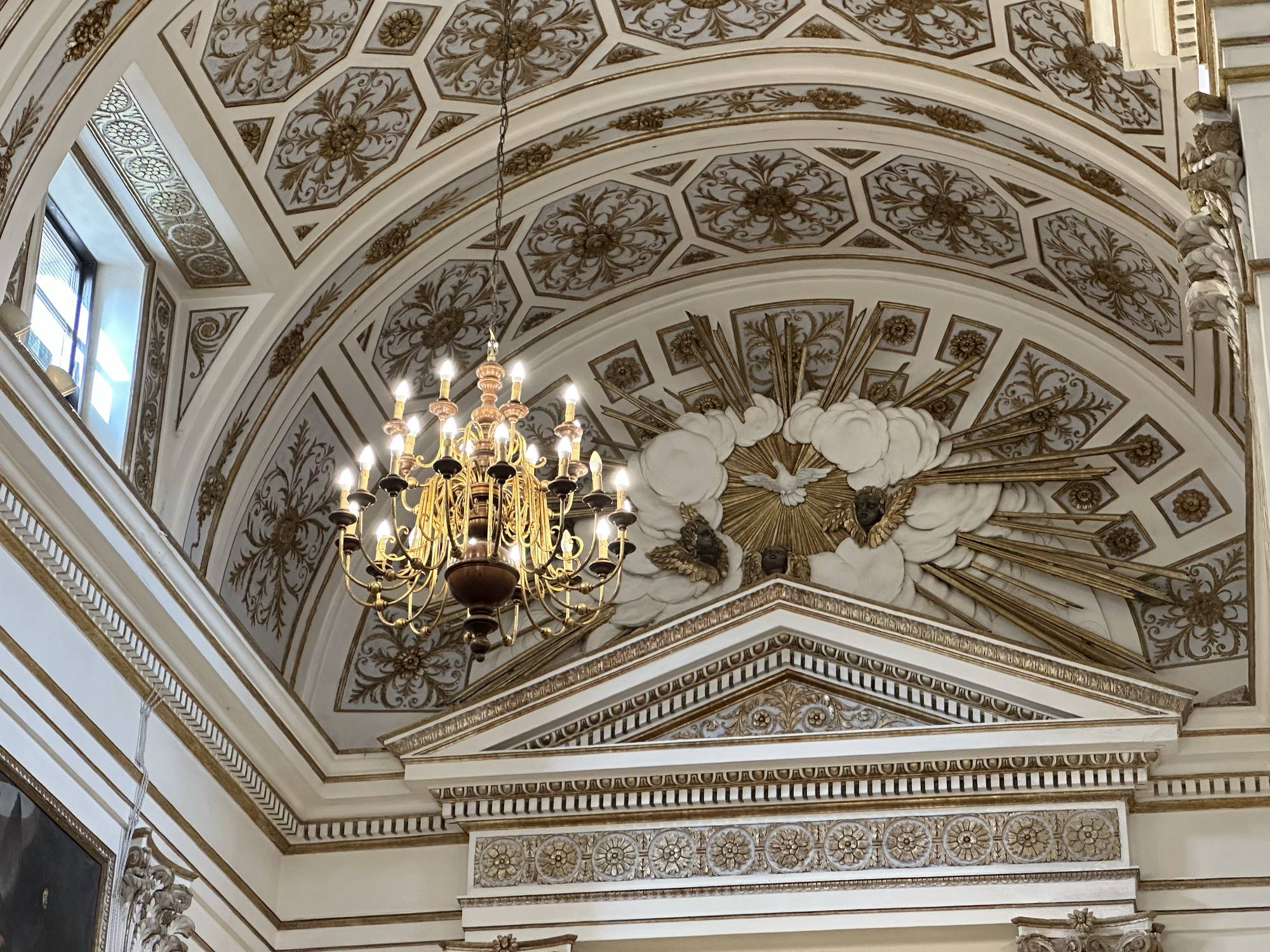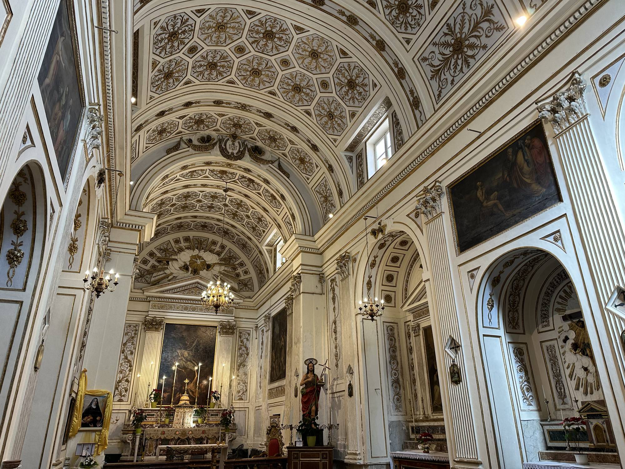 Gli stucchi bianchi che adornano le pareti e i soffitti si fondono armoniosamente con il pavimento in marmo bianco e nero, creando un ambiente solenne ma accogliente. La chiesa ospita sei cappelle e sette altari, un mix di opere in marmo e legno che dimostrano l'artigianato eccellente dei maestri scultori e intagliatori locali.