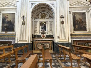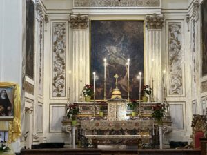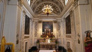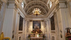 Scorgendo lo sguardo verso sinistra troviamo la prima cappella, al centro sopra un altare ligneo finemente decorato, è posizionata una tela attribuita all’artista Giovanni Patricolo che raffigura la Madonna che porge il bambino a San Gaetano. In questa tela, la scena rappresenta la Vergine Maria, vestita con un ampio manto azzurro e una veste rossa, mentre tiene in braccio il Bambino Gesù. Maria appare serena e dolce, in un atteggiamento materno. Gesù Bambino è raffigurato con un’aura luminosa attorno alla testa (simbolo della sua divinità) e con un sorriso vivace. Egli si protende gioiosamente verso San Gaetano, che lo accoglie con grande devozione. Il santo, riconoscibile dal saio scuro tipico dei Teatini, è inginocchiato in adorazione. Le sue mani sono aperte nel gesto di ricevere il Bambino, a simboleggiare la sua fede e la sua totale dedizione alla volontà divina. Lo sfondo è molto sfumato e morbido, creando un effetto di luminosità eterea che conferisce sacralità e solennità alla scena. La composizione è equilibrata, con la Vergine e il Bambino posti nella parte superiore e San Gaetano in basso, accentuando così il suo atteggiamento di umiltà e devozione.