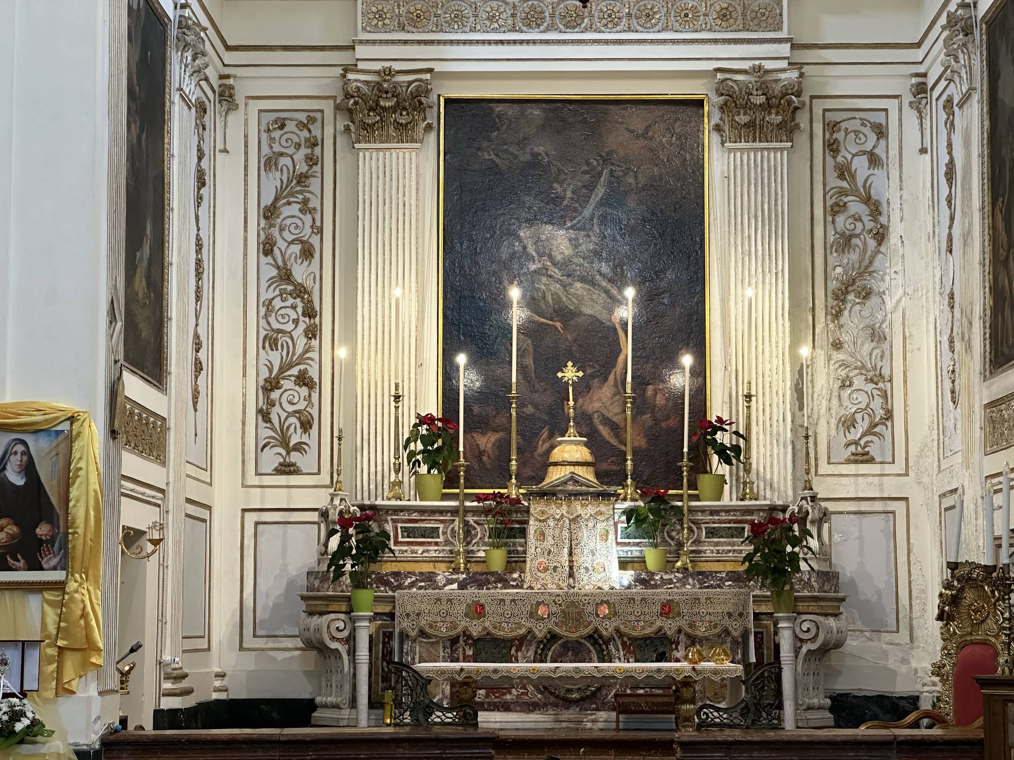 Alzando lo sguardo incorniciato tra due colonne con capitelli corinzi e una trabeazione, decorati in oro, troviamo una maestosa tela attribuita ai fratelli Antonio e Vincenzo Manno, pittori siciliani attivi tra il XVIII e XIX secolo. Il loro stile, fortemente influenzato dal Barocco e dal Neoclassicismo, si distingue per la drammaticità delle scene sacre e per l'uso magistrale della luce e dei chiaroscuri.