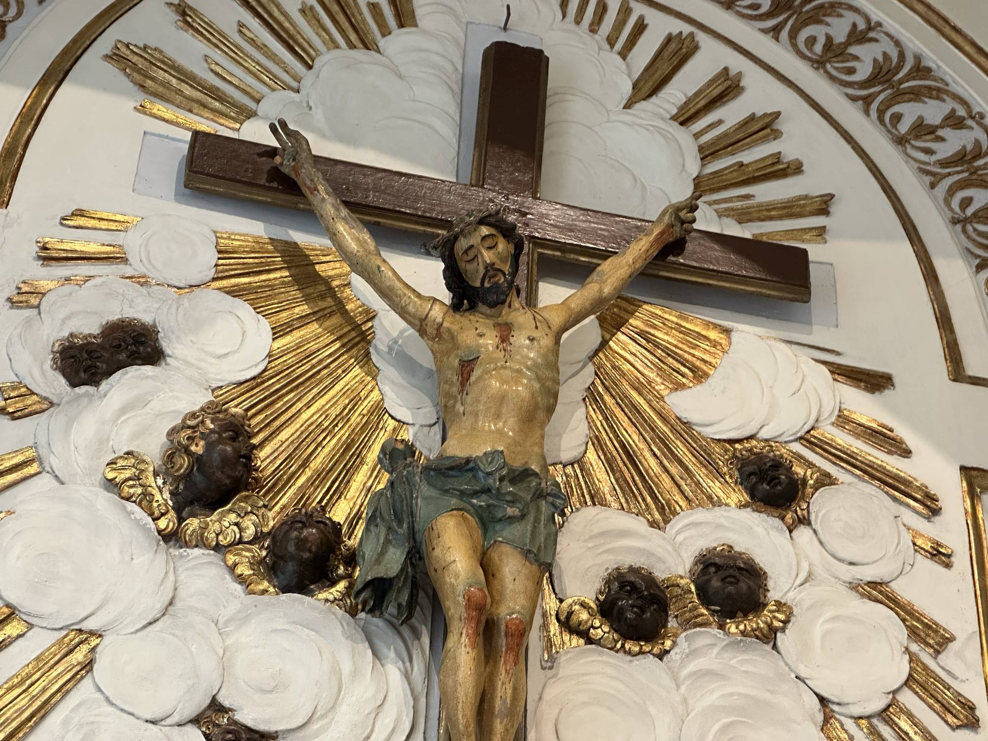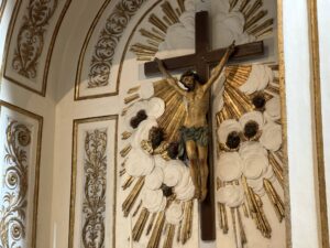 Subito dopo è posta una cappella con volta ribassata che ospita un suggestivo altare dedicato alla Passione di Cristo, con una statua lignea del Crocifisso come elemento centrale. L'intera struttura è riccamente decorata con elementi dorati e presenta un’armoniosa combinazione di simboli teologici legati alla redenzione e alla misericordia divina. La statua lignea del Cristo Crocifisso, di autore ignoto, è realizzata con il volto sofferente di Gesù, con gli occhi semiaperti e il capo reclinato, e richiama la fase finale della Passione, sottolineando la sua umanità e il suo sacrificio per la redenzione dei peccati. La croce in legno scuro si staglia su un fondale bianco, circondato da raggi dorati, a simboleggiare la luce della redenzione e la vittoria della croce sulla morte. Nuvole scolpite con teste di cherubini dorati avvolgono la croce, un chiaro richiamo alla gloria celeste e alla presenza divina che accoglie Cristo nel momento del suo sacrificio. La base dell’altare è rivestita in marmo policromo con dettagli dorati, riprendendo il tipico stile barocco siciliano. Un piccolo tabernacolo centrale, con sportello dorato, è posto sotto la croce, probabilmente destinato alla conservazione dell’Eucaristia.