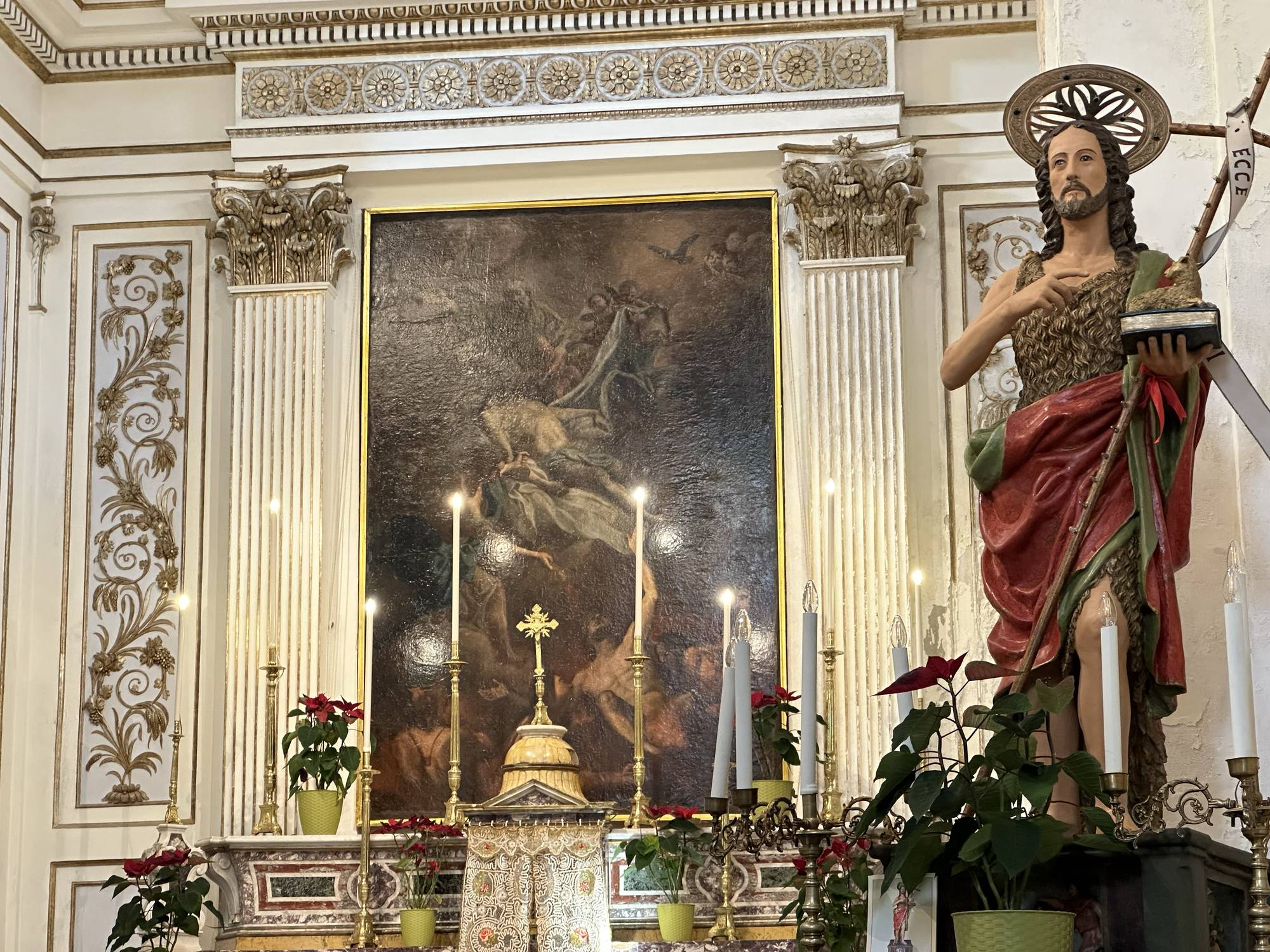 Scorrendo con lo sguardo verso destra ti troverai di fronte ad una terza cappella dove al centro è posizionato un altare su cui si eleva una splendida tela anch’essa attribuita a Giovanni Patricolo dove viene raffigurato San Giovanni Battista. Esso viene ritratto nel suo ruolo di precursore di Cristo. La tela rappresenta una scena del suo ministero di predicazione, sottolineando il suo ruolo chiave nel Nuovo Testamento come colui che prepara la via al Salvatore. San Giovanni Battista è raffigurato in abiti tipici dell’iconografia tradizionale: indossa una tunica semplice in tessuto ruvido, spesso associata al suo stile di vita ascetico nel deserto. Il santo è seduto su una roccia e solleva il braccio destro in un gesto di predicazione, probabilmente indicando il cielo, alludendo alla venuta di Cristo. Con la mano sinistra regge il bastone con la croce e il cartiglio con la scritta “Ecce Agnus Dei” che tradotto significa “Ecco l’Agnello di Dio”. Ai piedi del santo è raffigurato un agnello, simbolo di Cristo, che richiama il passo evangelico in cui Giovanni indica Gesù come l’Agnello di Dio venuto a togliere i peccati del mondo. Attorno a San Giovanni vi sono alcuni ascoltatori, probabilmente discepoli o persone che lo seguono, vestiti con abiti tipici del tempo biblico. Le espressioni dei loro volti suggeriscono attenzione e ascolto. Lo sfondo è caratterizzato da un paesaggio naturale con alberi e cielo sfumato, creando un’atmosfera mistica e suggestiva.