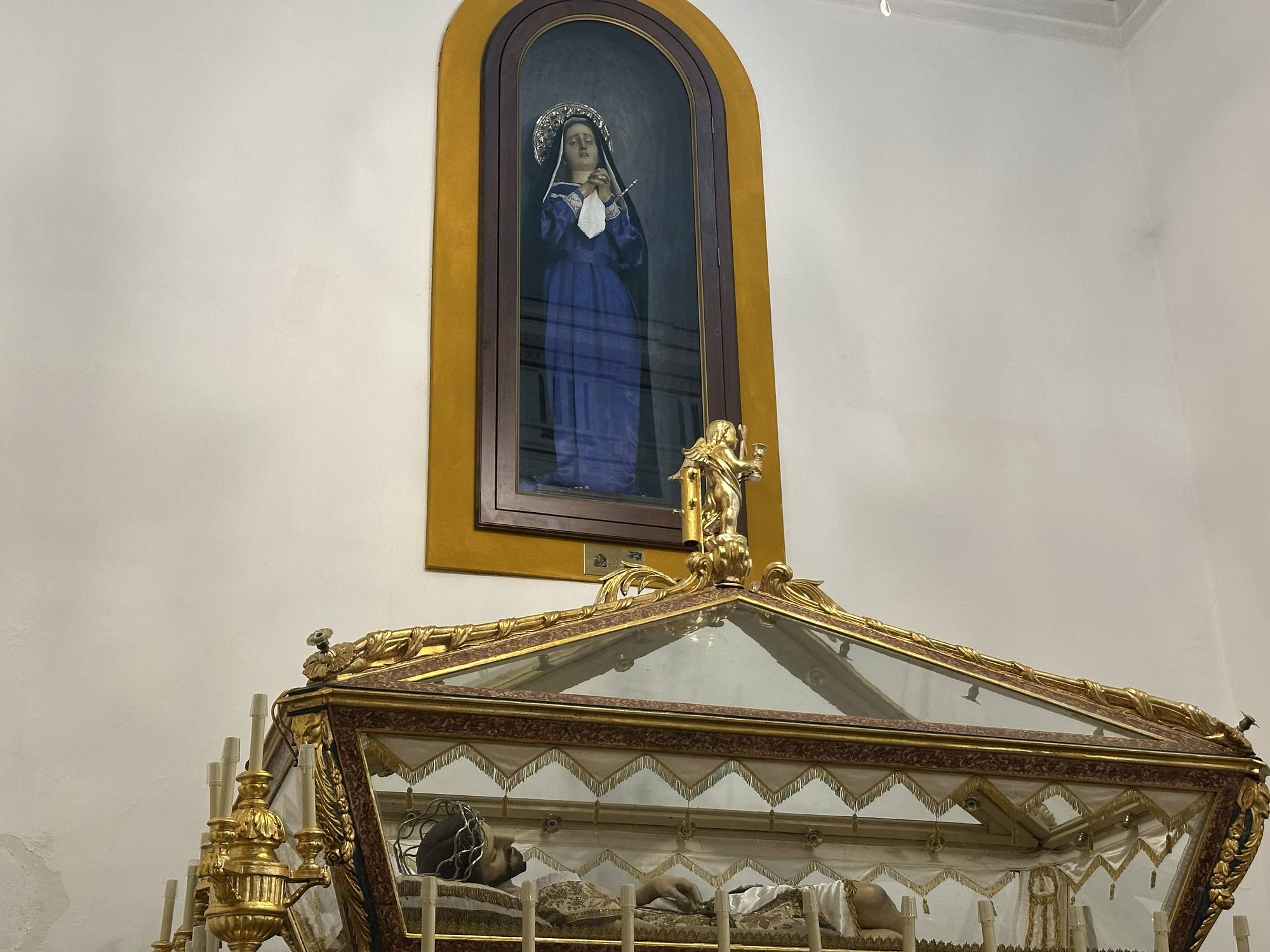 Nella prima Cappella posta a sinistra dell’ingresso, all’interno della bara in vetro è posto il simulacro in legno del Cristo Morto, e sopra di esso all’interno della nicchia centrale è posta la statua della Madonna Addolorata. Entrambe le opere sono realizzate in legno, dallo scultore Piscitello, sono state realizzate tra il mille ottocento ottantacinque e il mille ottocento ottantotto. Le statue sono protagoniste della processione del Venerdì Santo, guidata dalla congregazione dei Trentatré e dello Spirito Santo, è uno degli eventi più partecipati e sentiti dei riti della settimana santa. Il Cristo giace nel suo sepolcro, mentre l’Addolorata, con un’espressione di intenso dolore, guarda il corpo del Figlio.
