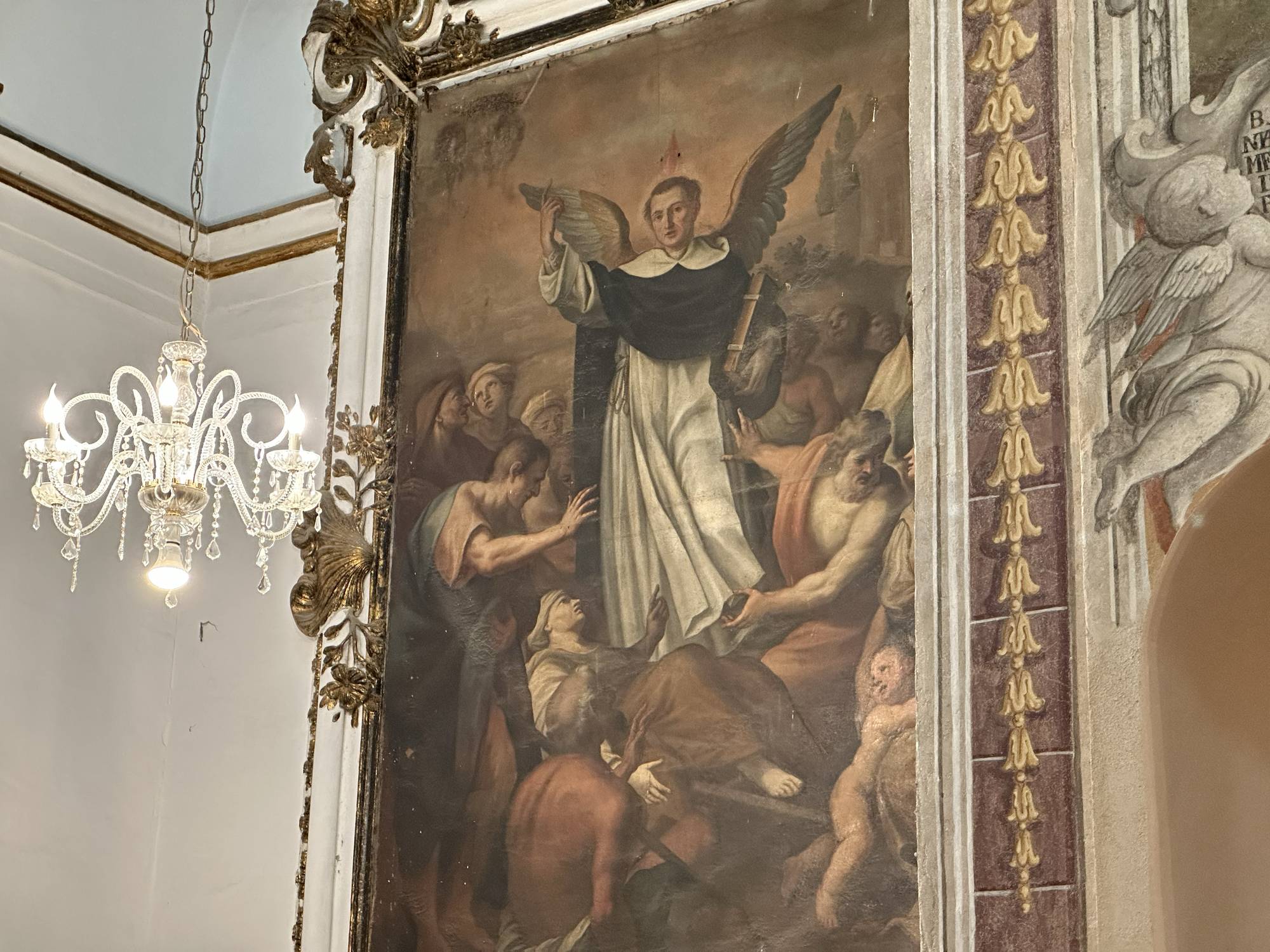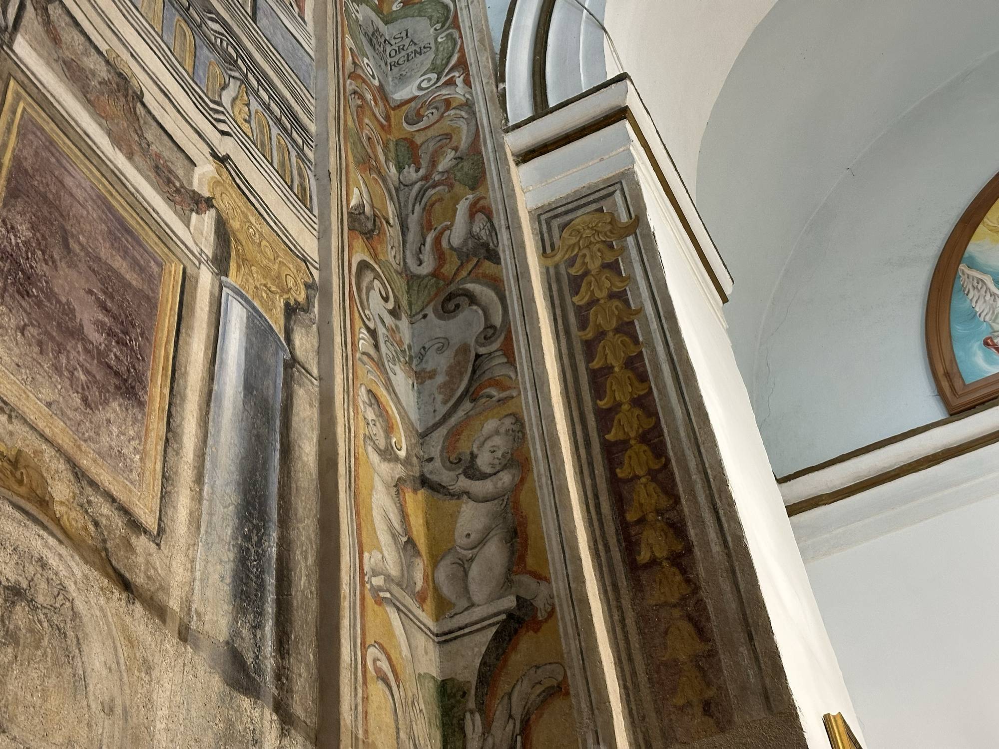 Proseguendo con lo sguardo nell’affresco della colonna addossata alla parete tra la seconda e la terza cappella gli angeli sorreggono l’immagine di Sant’Antonino.