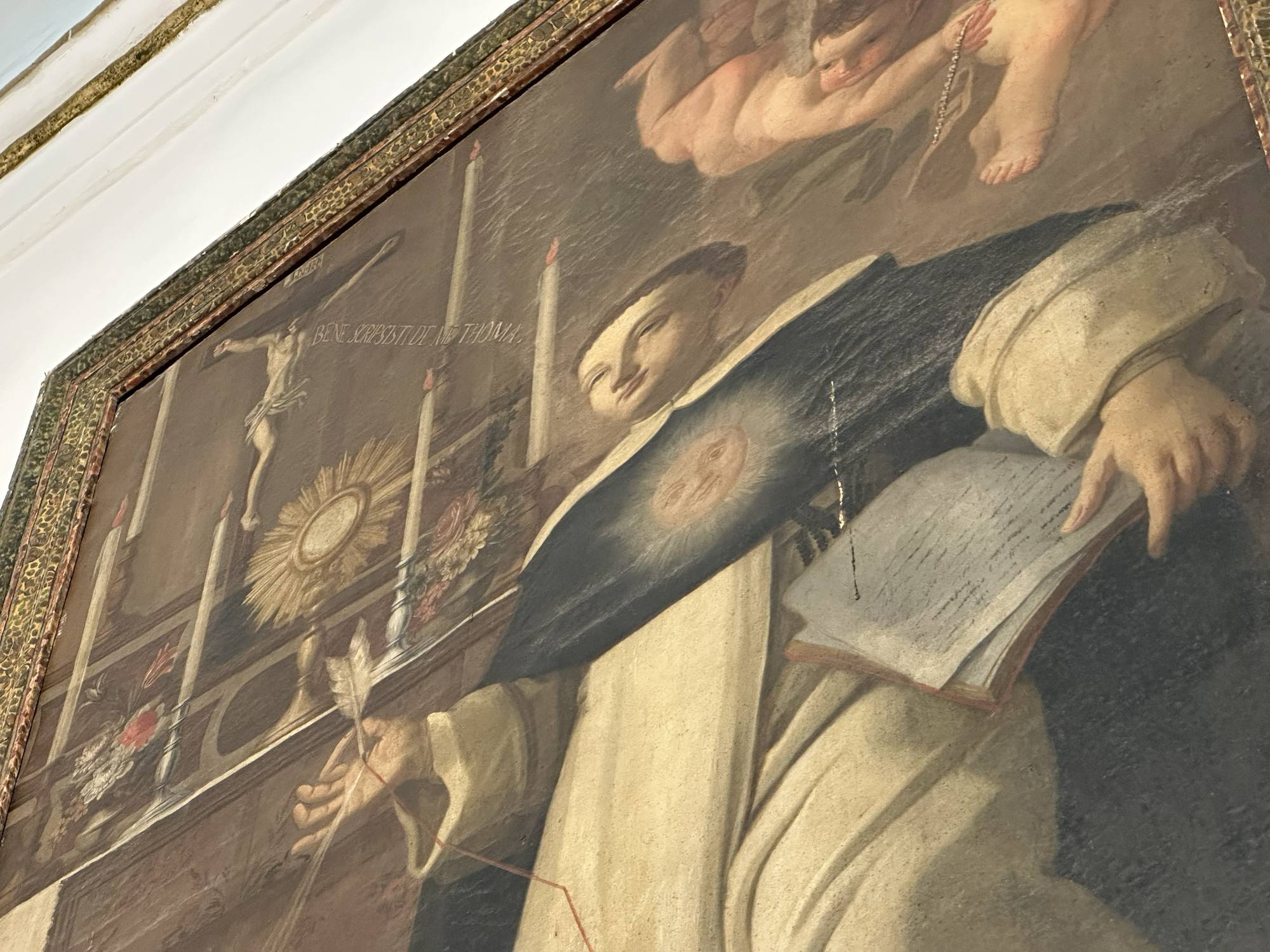 All’interno della quarta Cappella sopra l’altare ligneo è posta una tela raffigurante San Tommaso D’Acquino, il Santo riconoscibile negli abiti Domenicani della veste bianca con sopra il mantello nero ha sul petto un simbolo luminoso che richiama il sole della sapienza divina. Questo elemento è molto ricorrente nella sua tradizione iconografica poiché il Santo è uno dei più grandi filosofi e teologi cristiani. Nella mano sinistra tiene un libro, simbolo della sua vasta produzione teologica mentre nella mano destra impugna il giglio, segno di purezza. Alle sue spalle si vede un altare con un crocifisso ed un ostensorio che contiene l’eucaristia, segno nevralgico della dottrina teologica cristiana, la scena è arricchita dalla presenza di tre angeli che sorreggono segni simbolici. All’interno della Cappella sono poste due statue, alla destra la statua di Sant’ Eligio raffigurato in abiti vescovili tra cui la mitra riccamente decorata e il piviale ornato con elementi floreali. La statua posta a sinistra della Cappella è quella di San Leonardo raffigurato con l’abito Domenicano, nella mano sinistra tiene un libro simbolo della regola monastica, mentre la mano destra che si solleva indica l’insegnamento a cui il santo era dedito nelle sue opere di carità per i più deboli e bisognosi.
