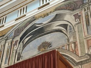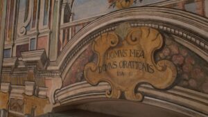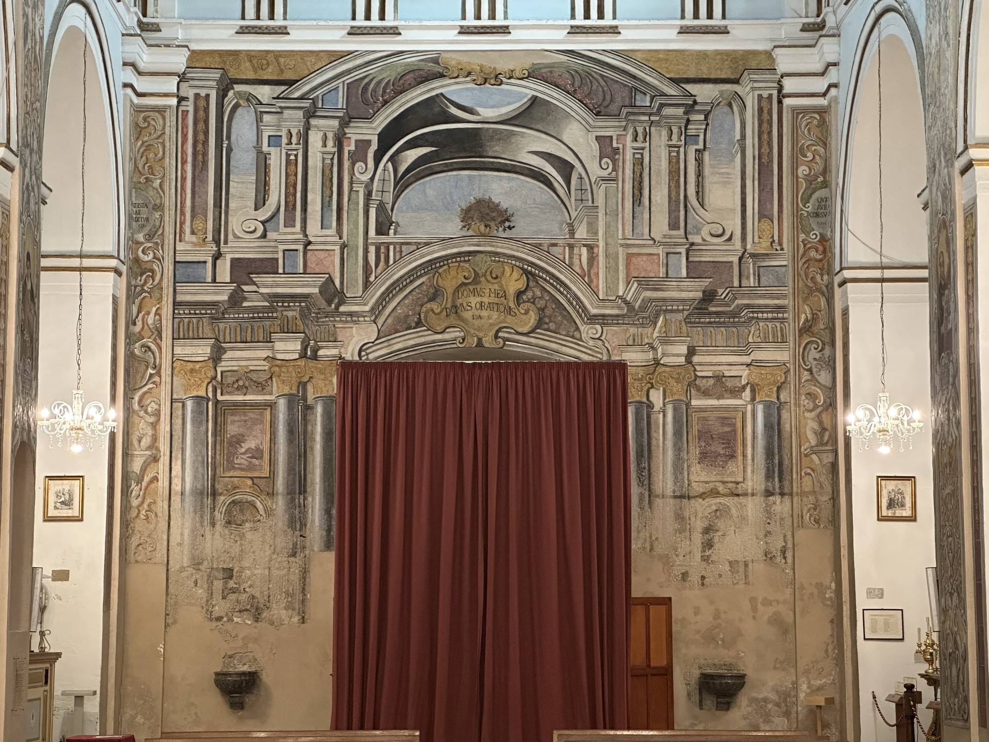 Ponendo in fine lo sguardo sulla facciata del contro altare l’affresco realizzato crea un immagine prospettica di altissimo impatto scenografico, il vano posto sopra il portale di ingresso sembra essere sorretto da sei colonne corinzie uno spazio che sembra affacciarsi all’interno della navata centrale, attraverso un balcone classico inserito in uno spazio la cui volta ha un vano circolare aperto verso il cielo al di sotto del parapetto e riportata la frase “DOMUS MEA DOMUS ORATIONIS” che tradotto dal latino significa la mia casa è una casa di preghiera.
