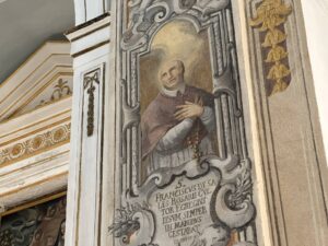 Posando lo sguardo sulla colonna addossata alla parete tra la terza e la quarta cappella sorretto da angeli troviamo un affresco raffigurante San Francesco di Sales.