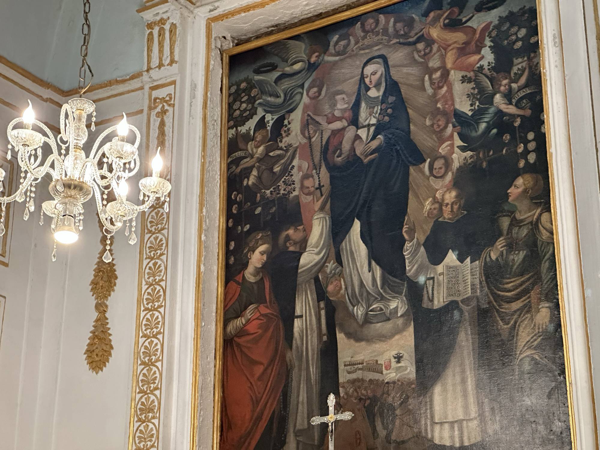 La cappella gentilizia presenta un altare marmoreo con un elegante tabernacolo, sopra di esso è posta una tela della Madonna del Rosario, attribuita a Vincenzo degli Azani detto “da Pavia”. La Vergine è raffigurata con il Bambino, che porge il Rosario ai fedeli, accompagnata da angeli e santi domenicani. La tela è incassonata tra due colonne in bassorilievo e una trabeazione finemente decorata in oro. Nell’ archivolto interno della cappella sono poste quindici tele quadrangolari che rappresentano i misteri del Rosario.