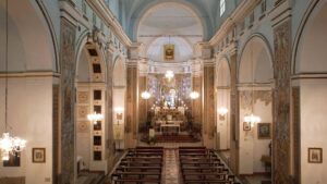 La navata unica enfatizza la profondità dello spazio, guidando lo sguardo verso il presbiterio e l’altare maggiore. Le pareti laterali, alte e lisce, sono interrotte da cappelle profonde che ospitano opere d’arte e simulacri.