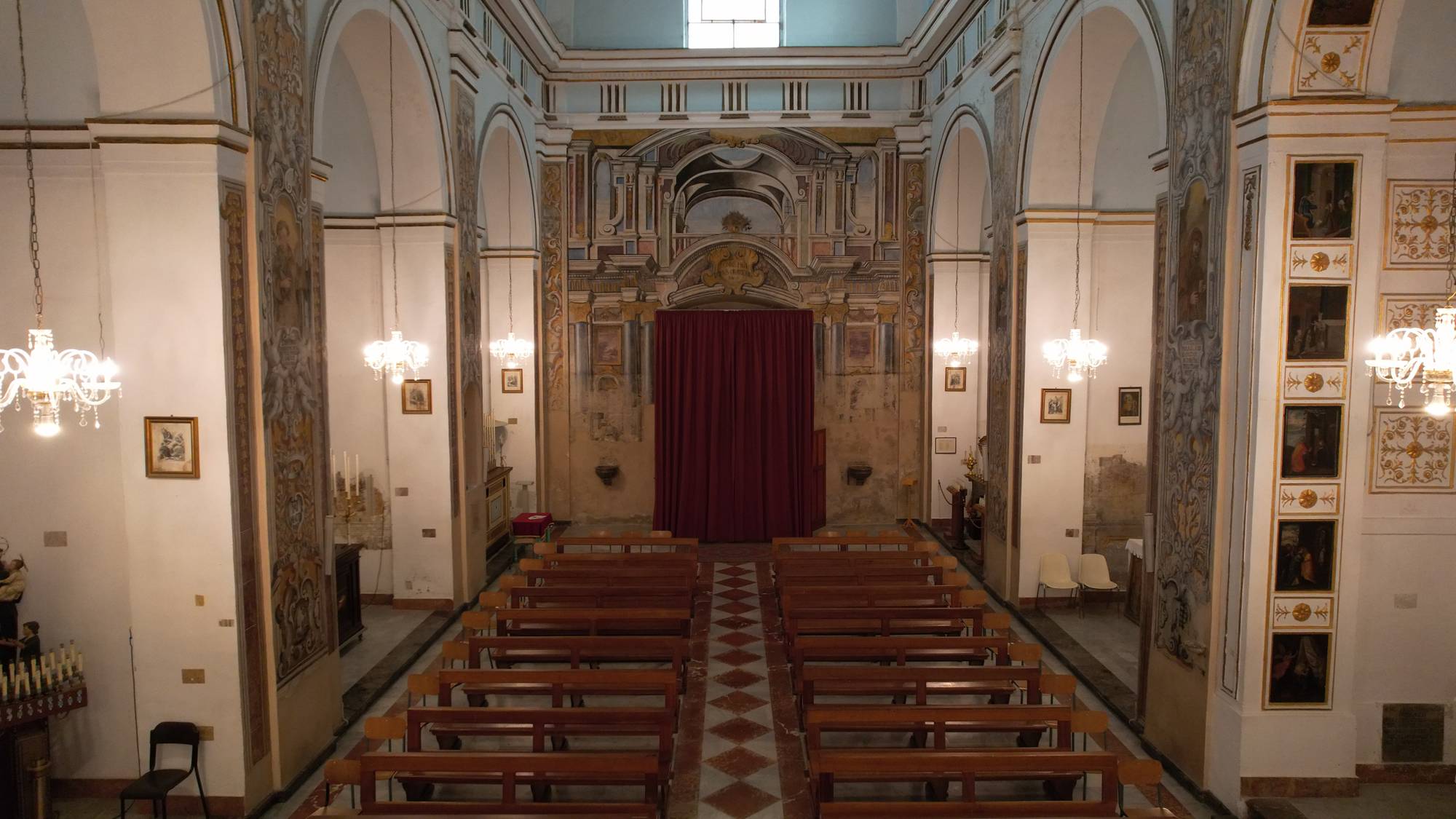 La volta che copre l’intera navata, è stata restaurata di recente. Un tempo decorata con rabeschi e fregi monocromatici del mille e settecento. Oggi di questi affreschi non ne rimane più traccia.