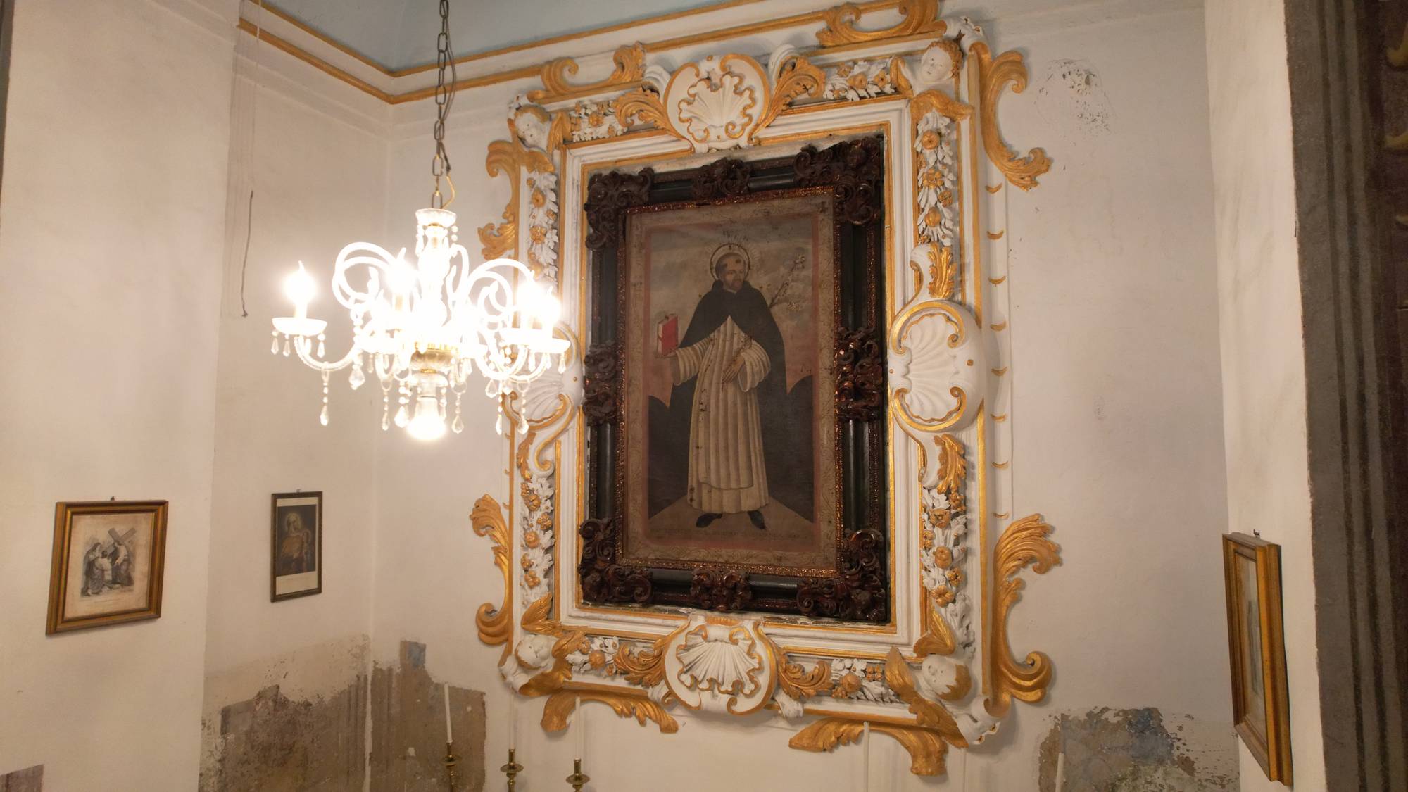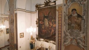 Subito dopo, la seconda cappella. Al di sopra dell’altare ligneo è posto un quadro raffigurante San Domenico in Soriano del milleseicento ottantaquattro opera di Francesco Camaro. Il Santo è ritratto in preghiera, con una visione della Madonna che benedice il fondatore dell’ordine. L’opera è incastonata in una cornice lignea intagliata, posta all’interno di una nicchia incorniciata da stucchi in gesso con rabeschi e foglie di acanto dipinte d’oro tipiche dello stile barocco.