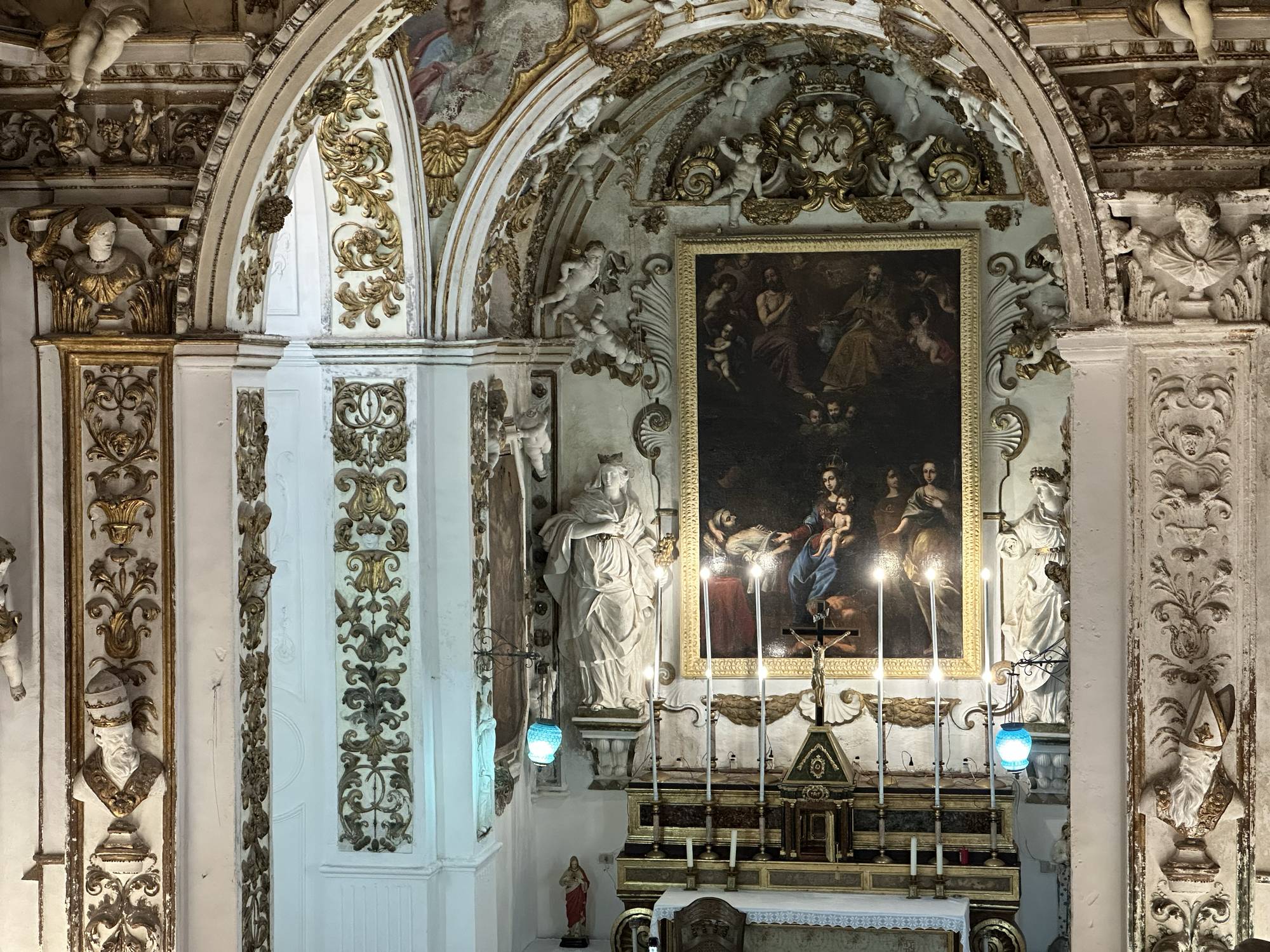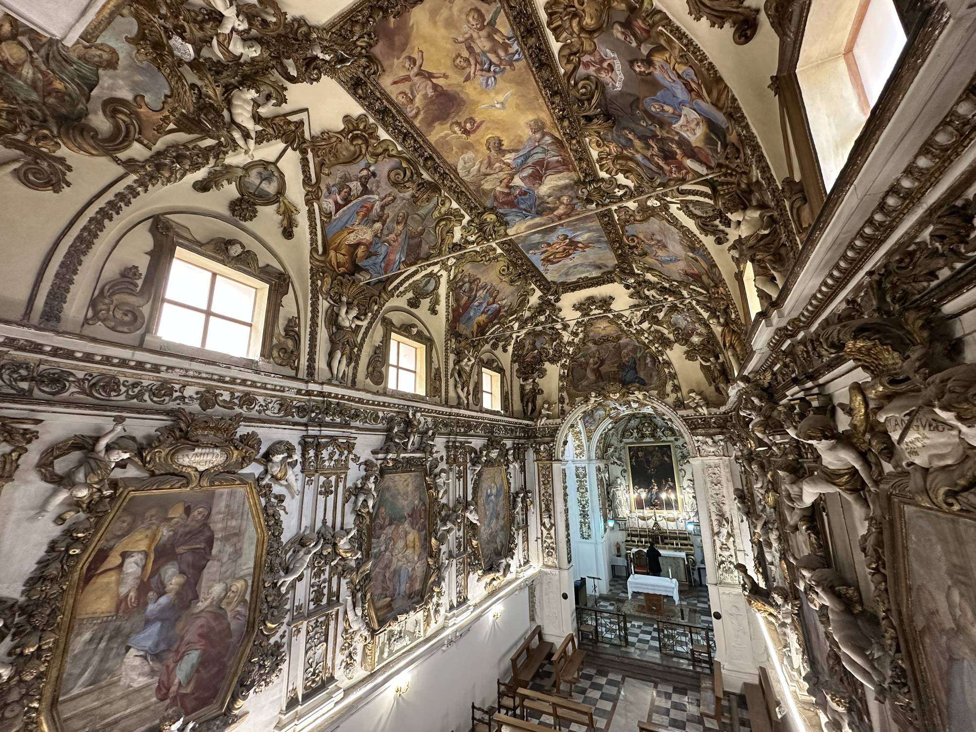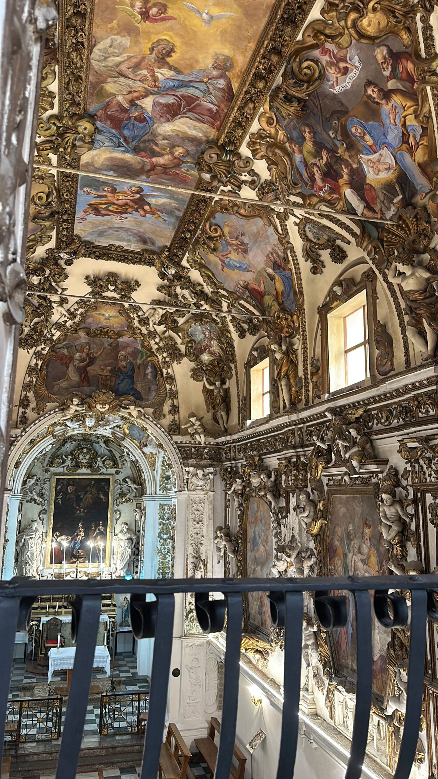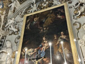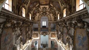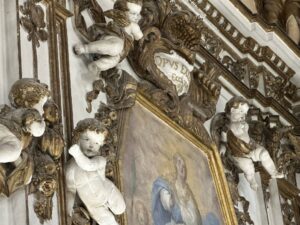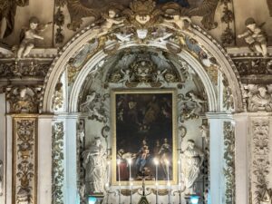 Osservate le pareti e le volte: sono decorate con stucchi dorati, realizzati dalla scuola di Giacomo Serpotta, un maestro del barocco siciliano. Questi dettagli brillanti catturano la luce, donando all’ambiente un’atmosfera quasi celestiale.
