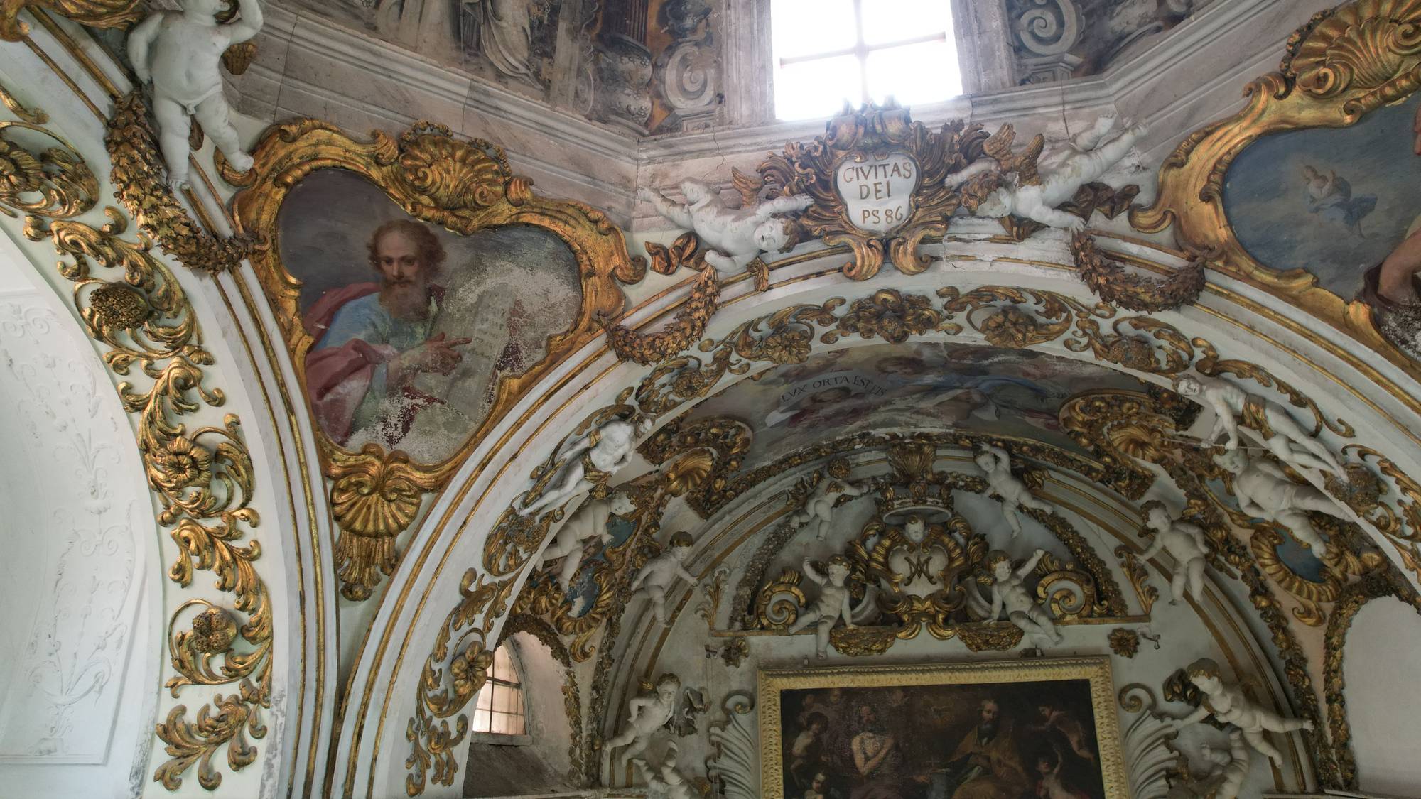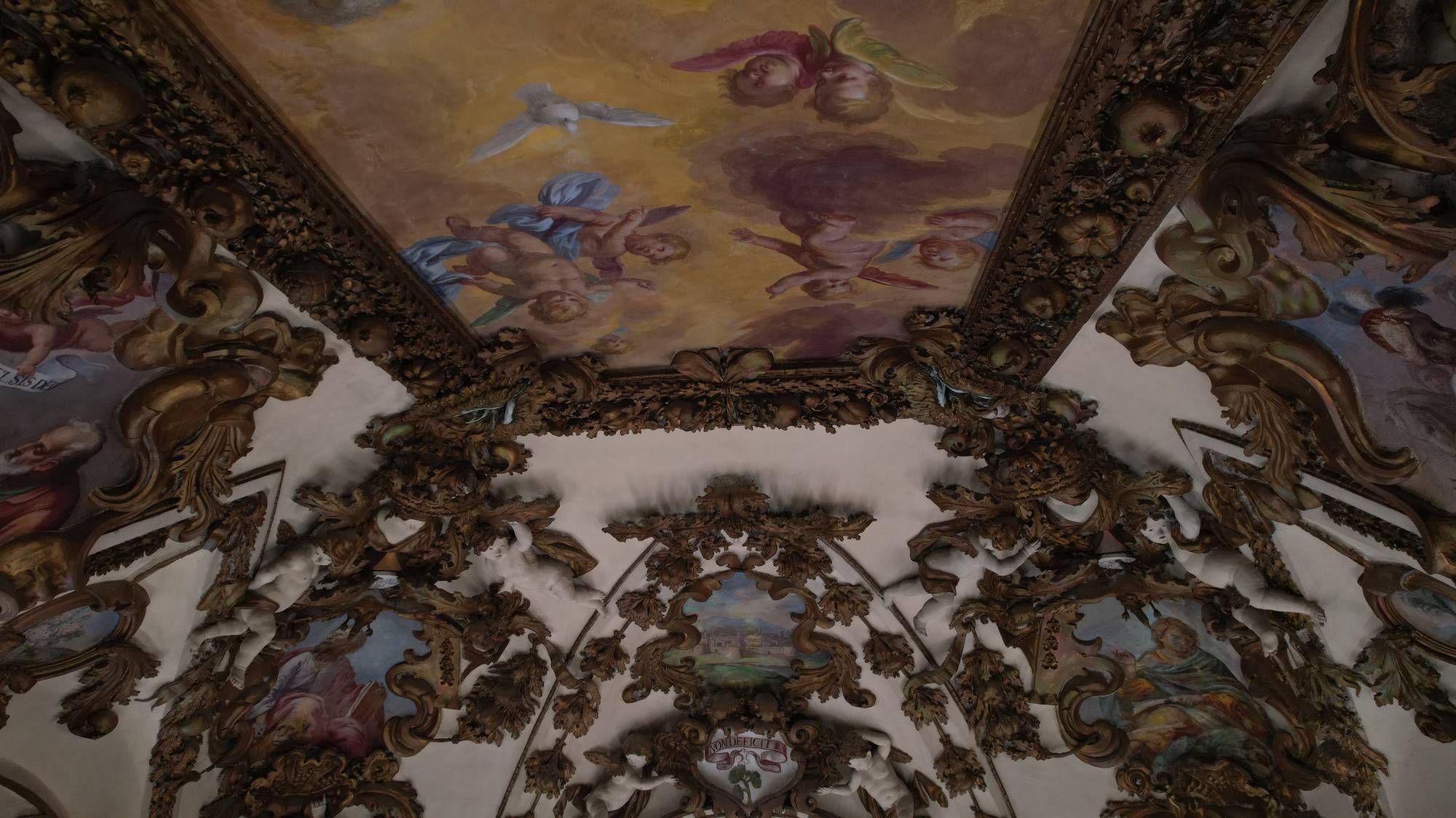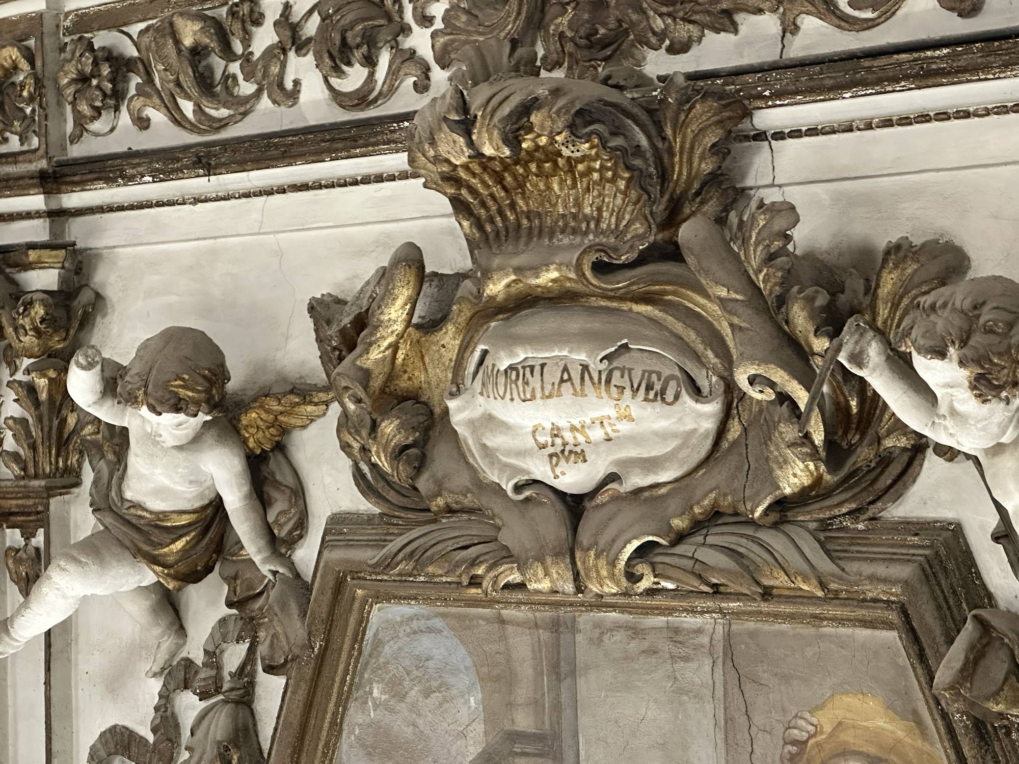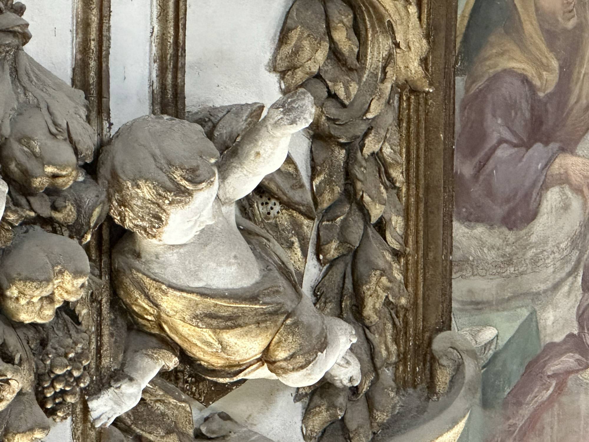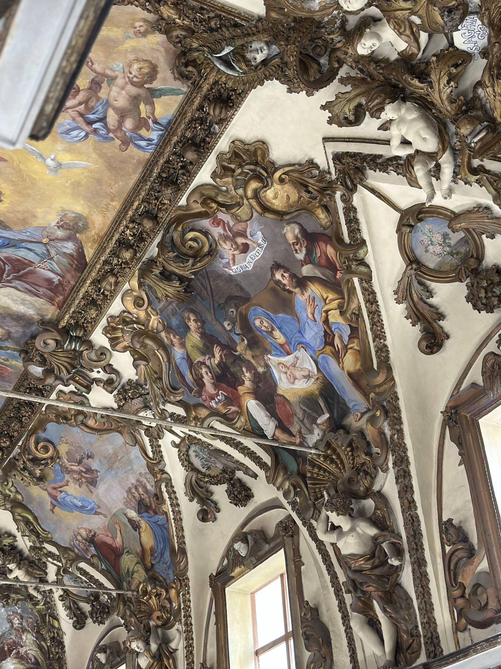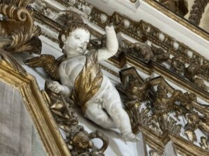Putti dorati in varie pose adornano le pareti e le cornici, conferendo movimento e gioia all’intero spazio. Festoni di melagrane, acanto e grappoli di frutta decorano i cornicioni, simboli di abbondanza e spiritualità.