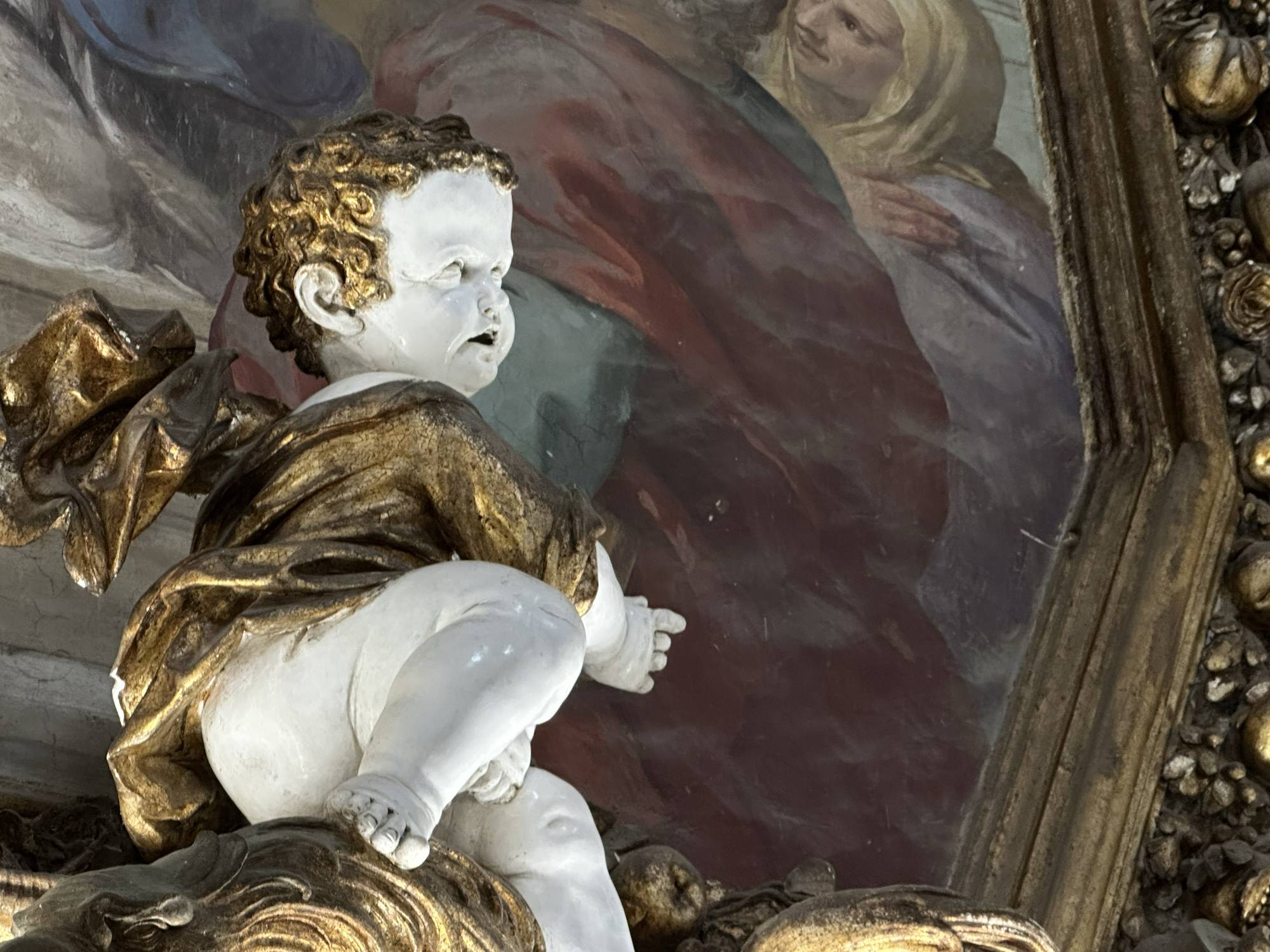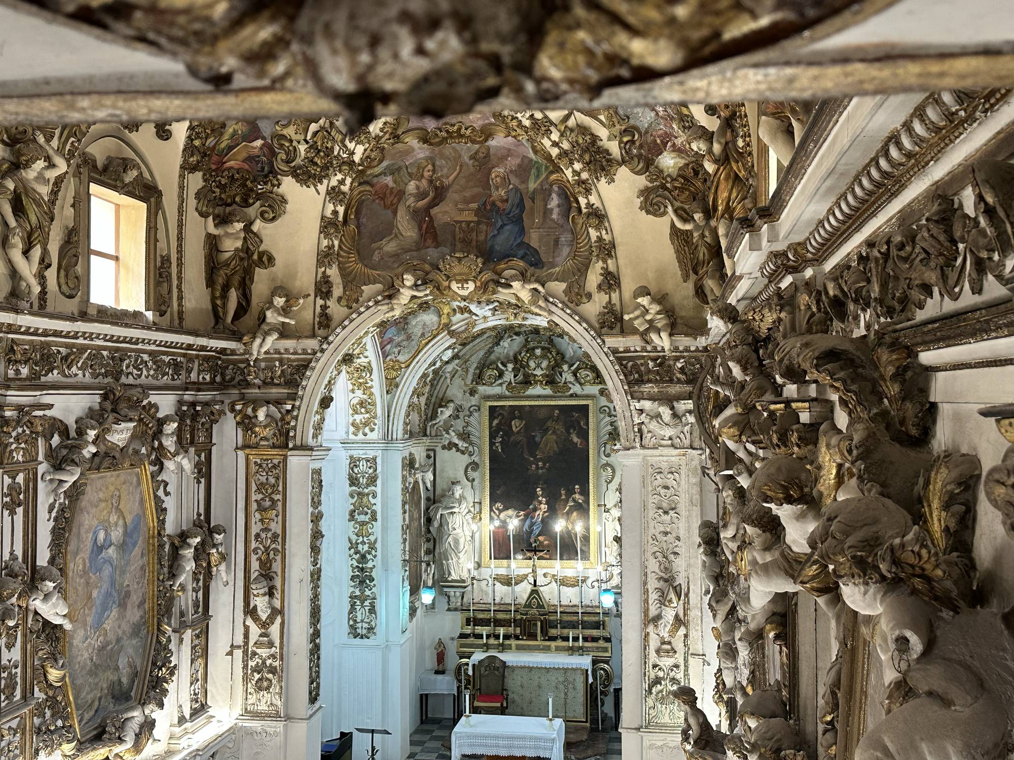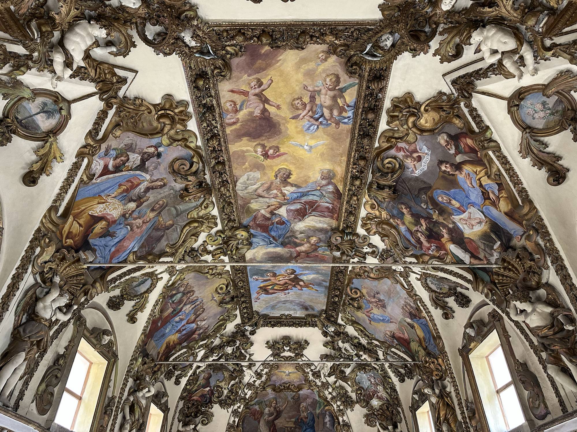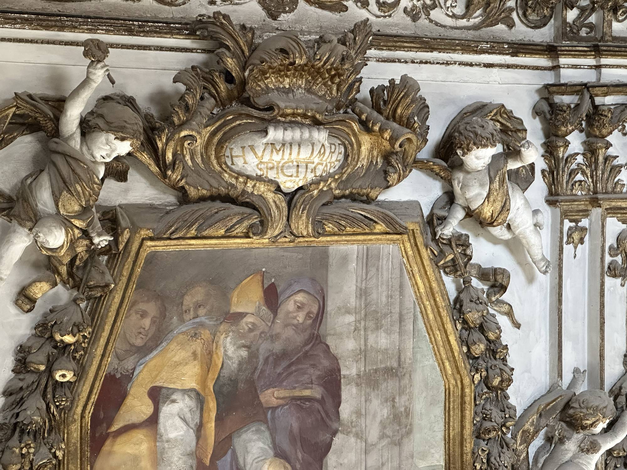Putti dorati in varie pose adornano le pareti e le cornici, conferendo movimento e gioia all’intero spazio. Festoni di melagrane, acanto e grappoli di frutta decorano i cornicioni, simboli di abbondanza e spiritualità.