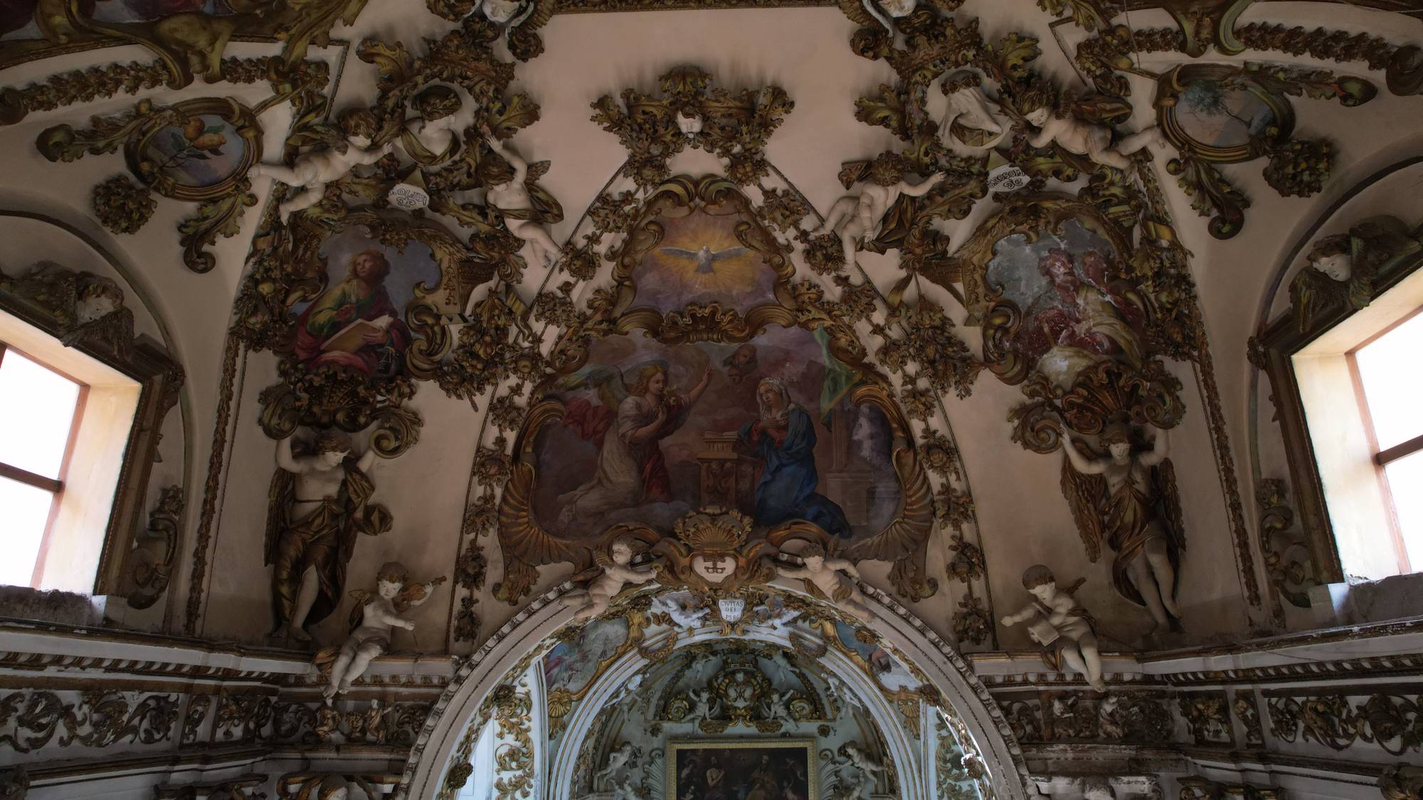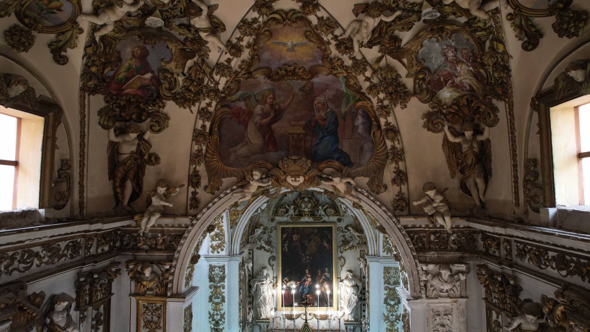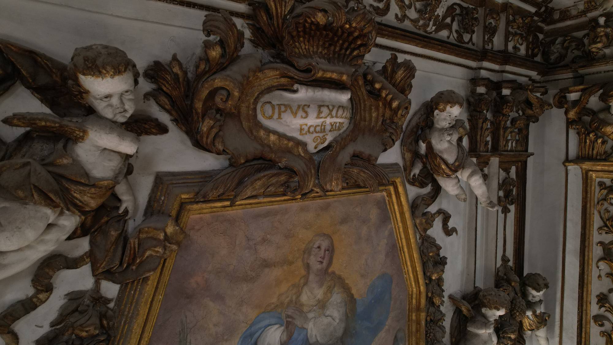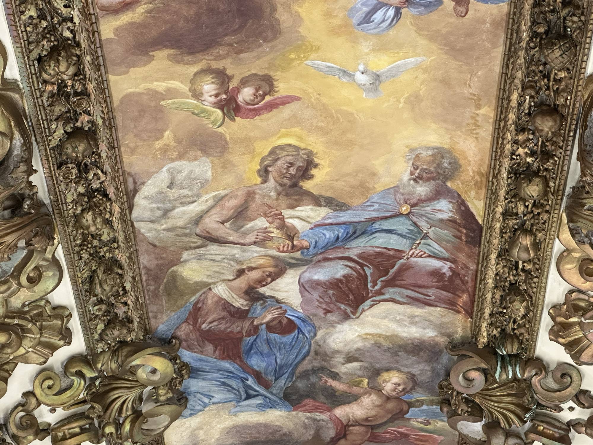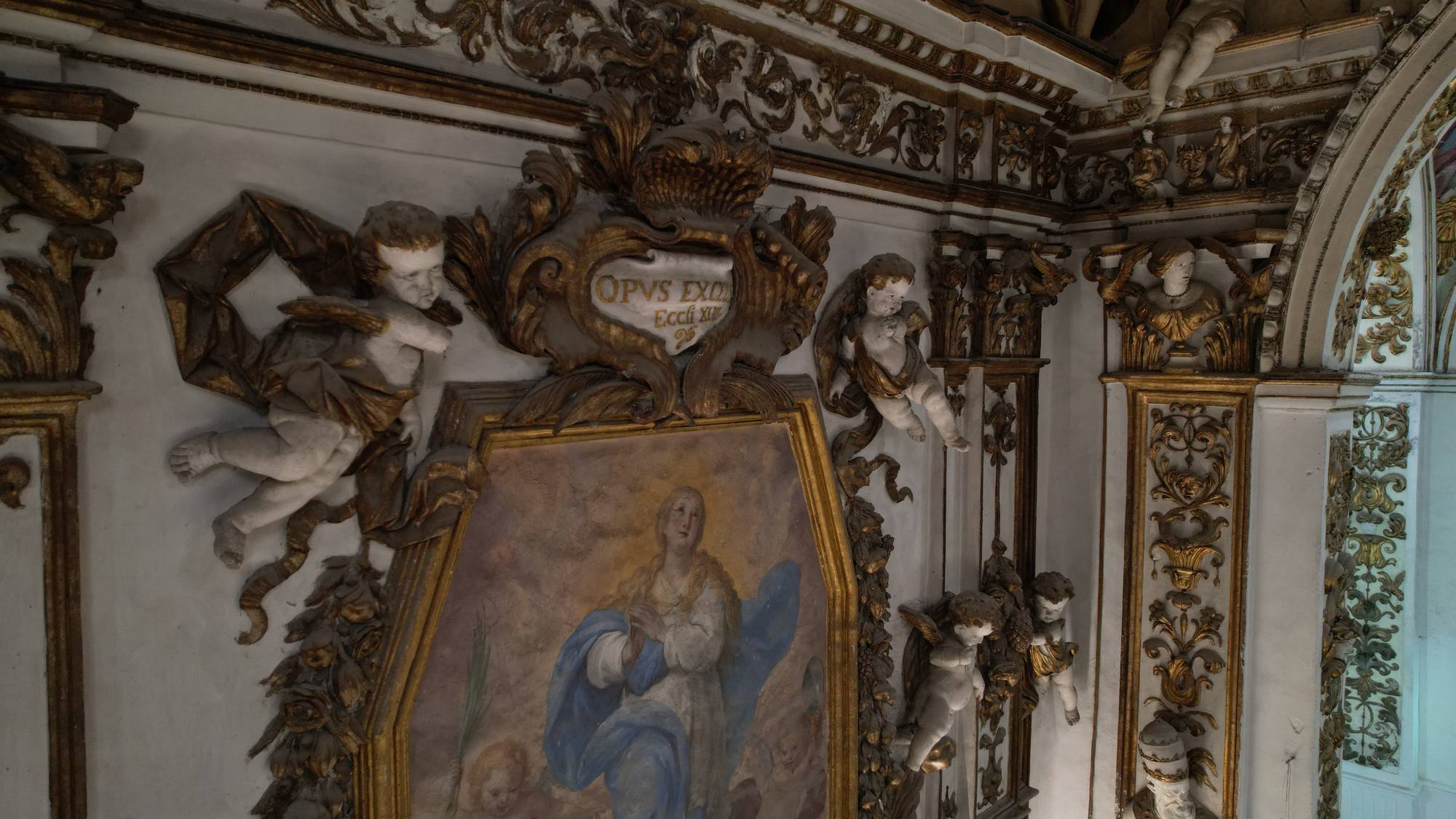 Putti dorati in varie pose adornano le pareti e le cornici, conferendo movimento e gioia all’intero spazio. Festoni di melagrane, acanto e grappoli di frutta decorano i cornicioni, simboli di abbondanza e spiritualità.