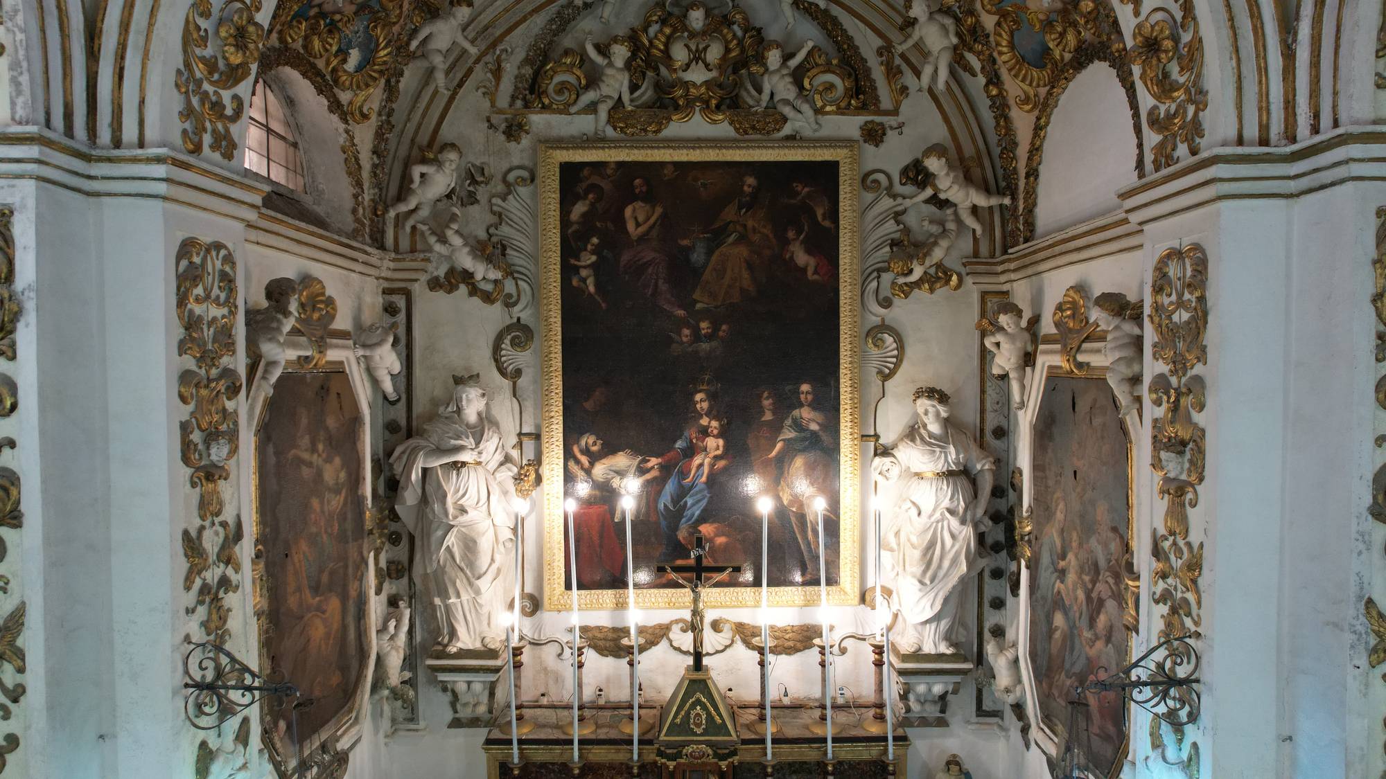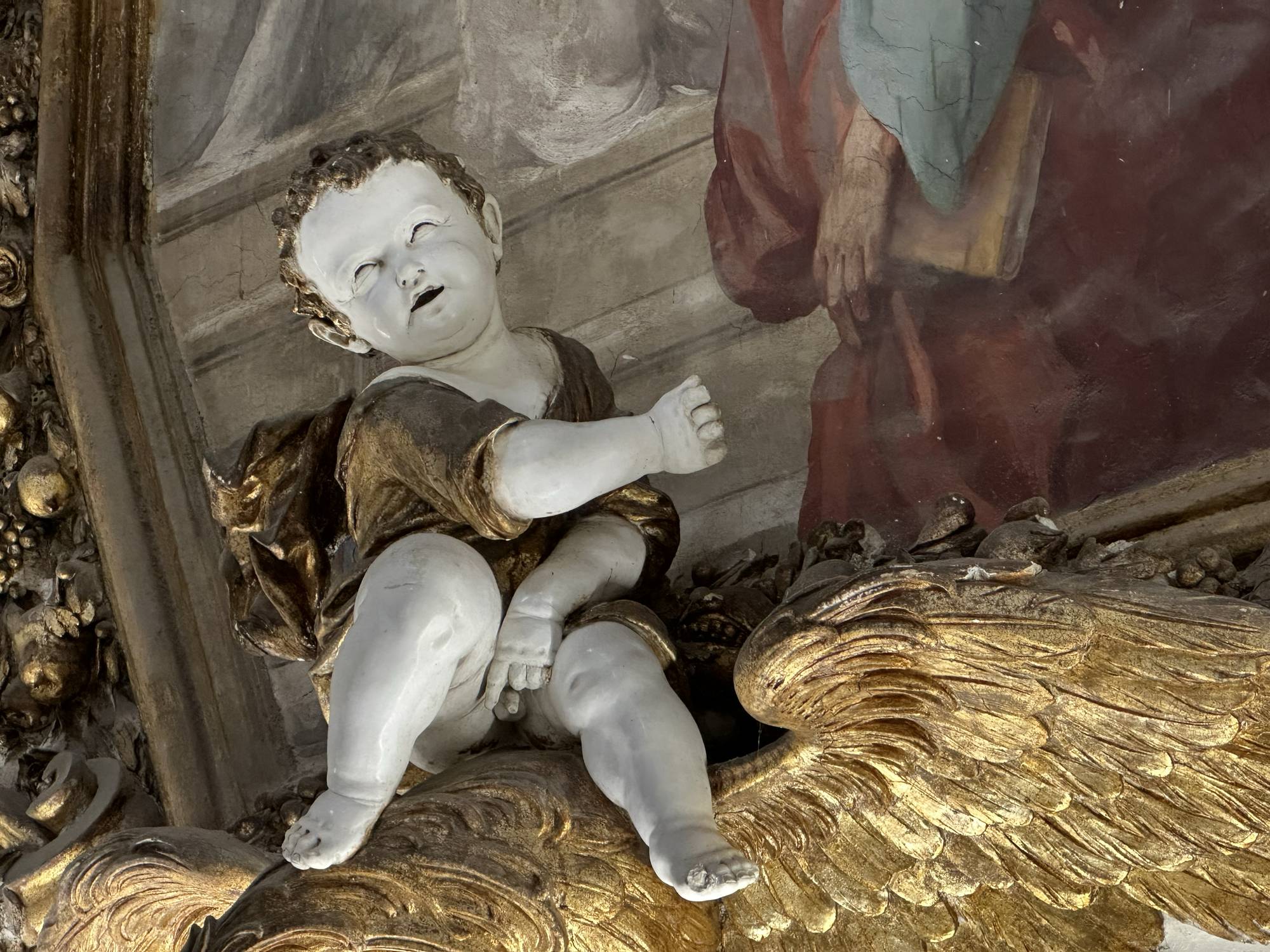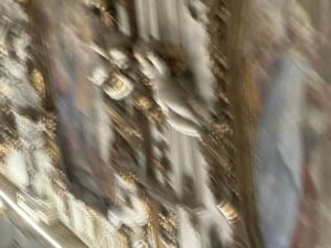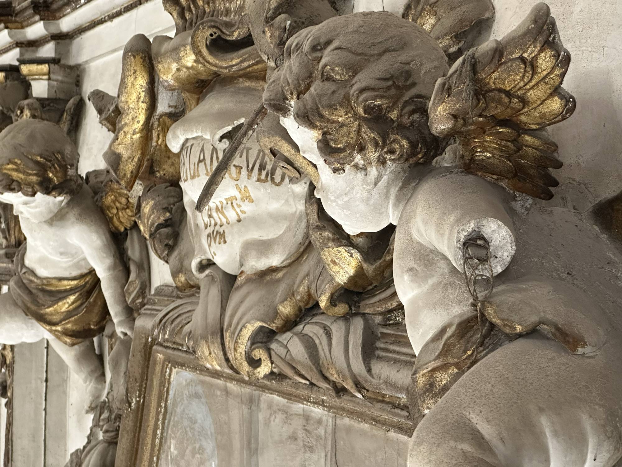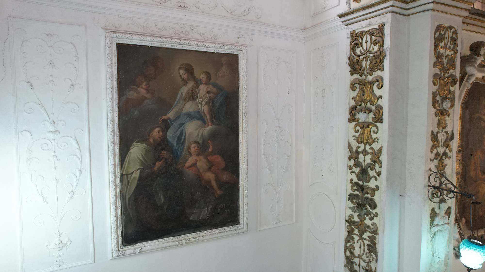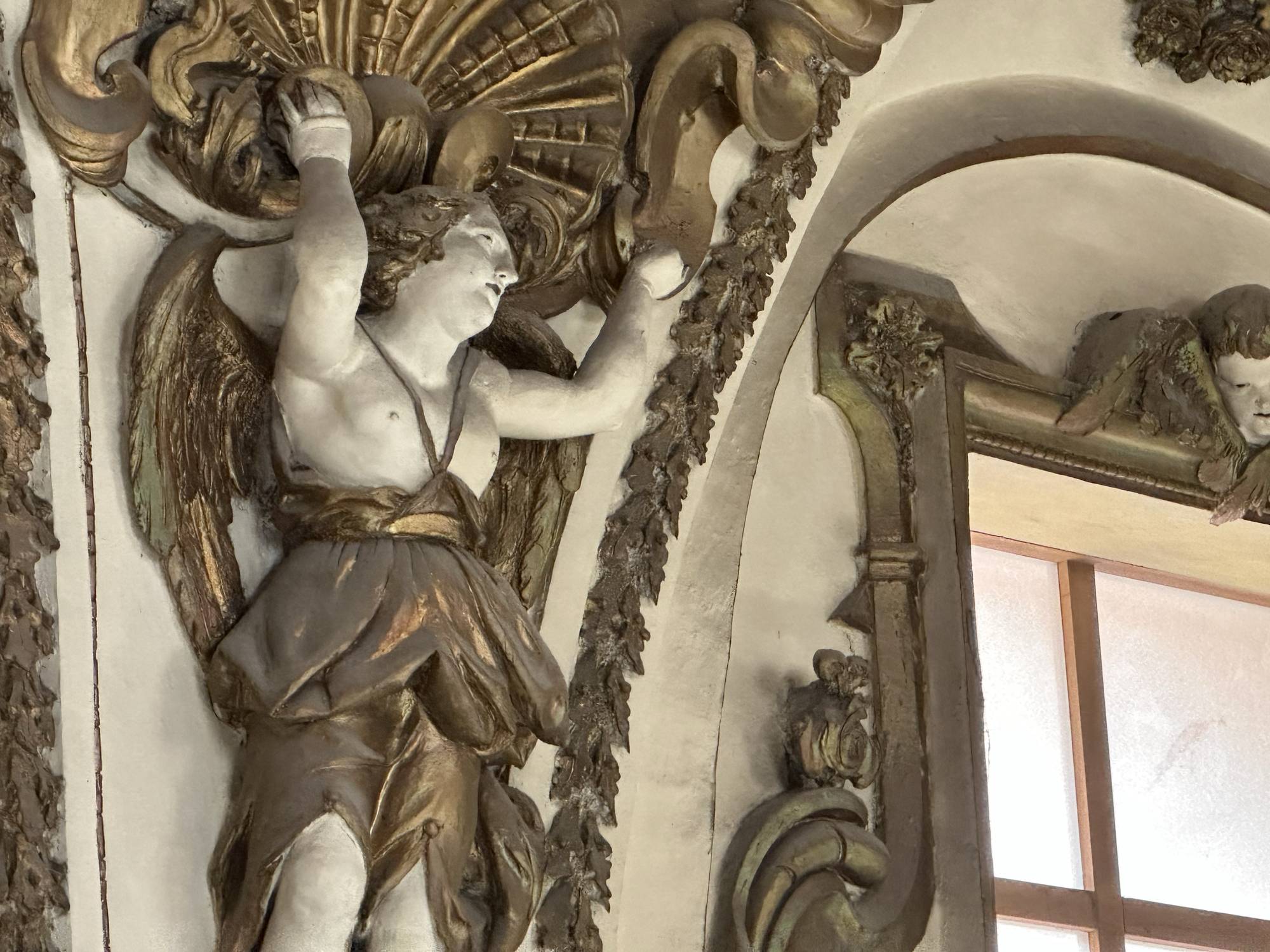 Putti dorati in varie pose adornano le pareti e le cornici, conferendo movimento e gioia all’intero spazio. Festoni di melagrane, acanto e grappoli di frutta decorano i cornicioni, simboli di abbondanza e spiritualità.