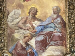 Ma adesso, gentile visitatore ti invito a posare lo sguardo sull’affresco della volta della Navata centrale che rappresenta l’Incoronazione della Vergine.