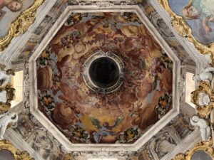 La luce mette in risalto i colori e le dorature degli affreschi, creando un contrasto suggestivo con le ombre delle decorazioni in stucco. L’effetto complessivo è quello di un ambiente celestiale, progettato per elevare lo spirito e avvicinare i fedeli alla dimensione divina.