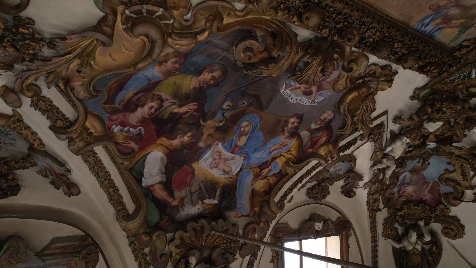 Sotto questo affresco è posto un teatrino in stucco raffigurano la Dormitio Virginis, circondata dagli angeli.