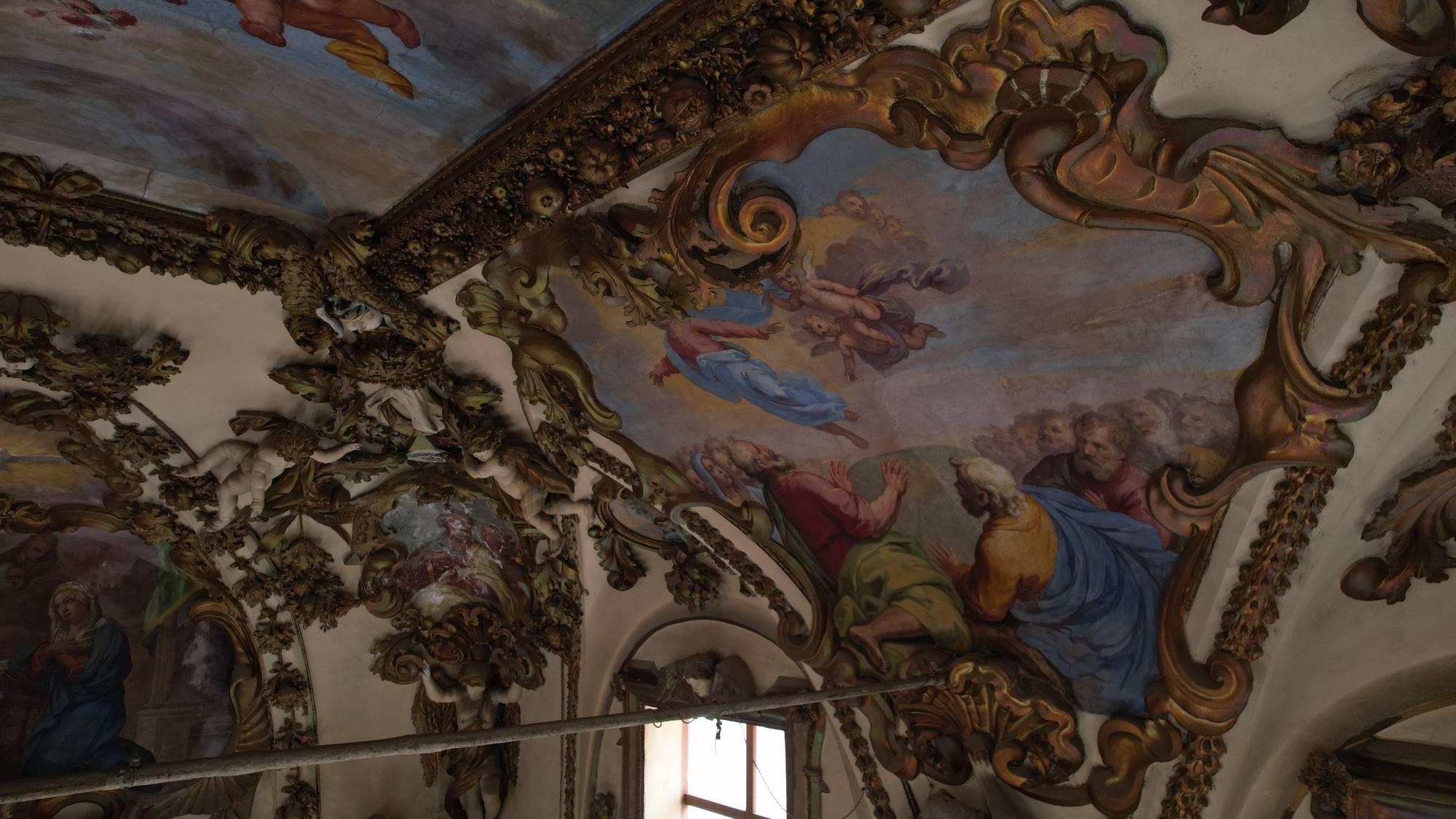 Ancora dopo, sopra una conchiglia dorata sorretta da un angelo, nella lunetta è realizzato l’affresco dell’ascensione di Cristo Signore. Cristo ascende al cielo tra nubi e angeli, e nella parte bassa sono rappresentati gli apostoli in preghiera.