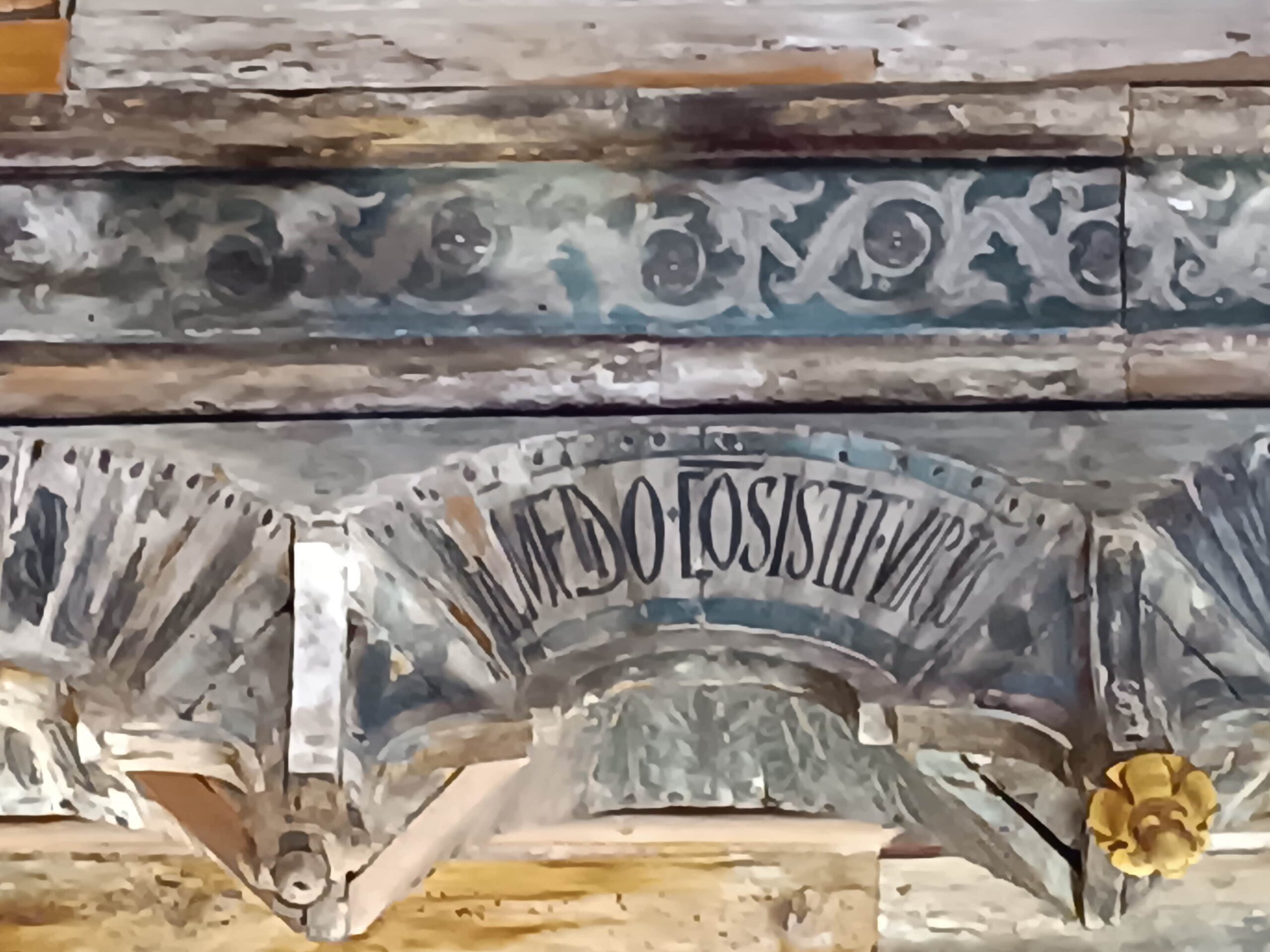 Al centro si legge la scritta gotica "In medio consistit virtus" ("Nel mezzo sta la virtù"), mentre sulle mensole laterali è incisa la frase "Et in extremis labora" ("Sono gli estremi che lavorano").
