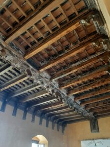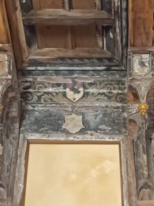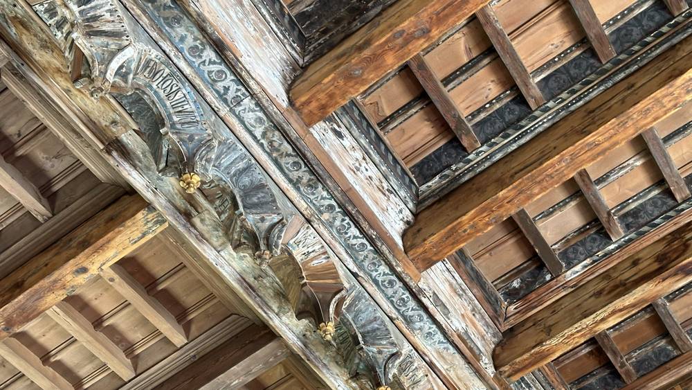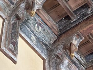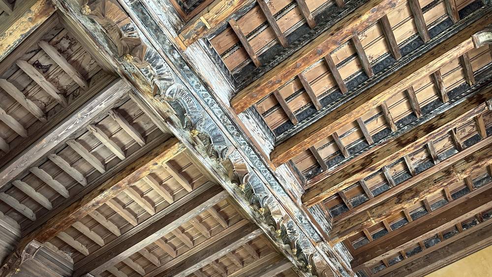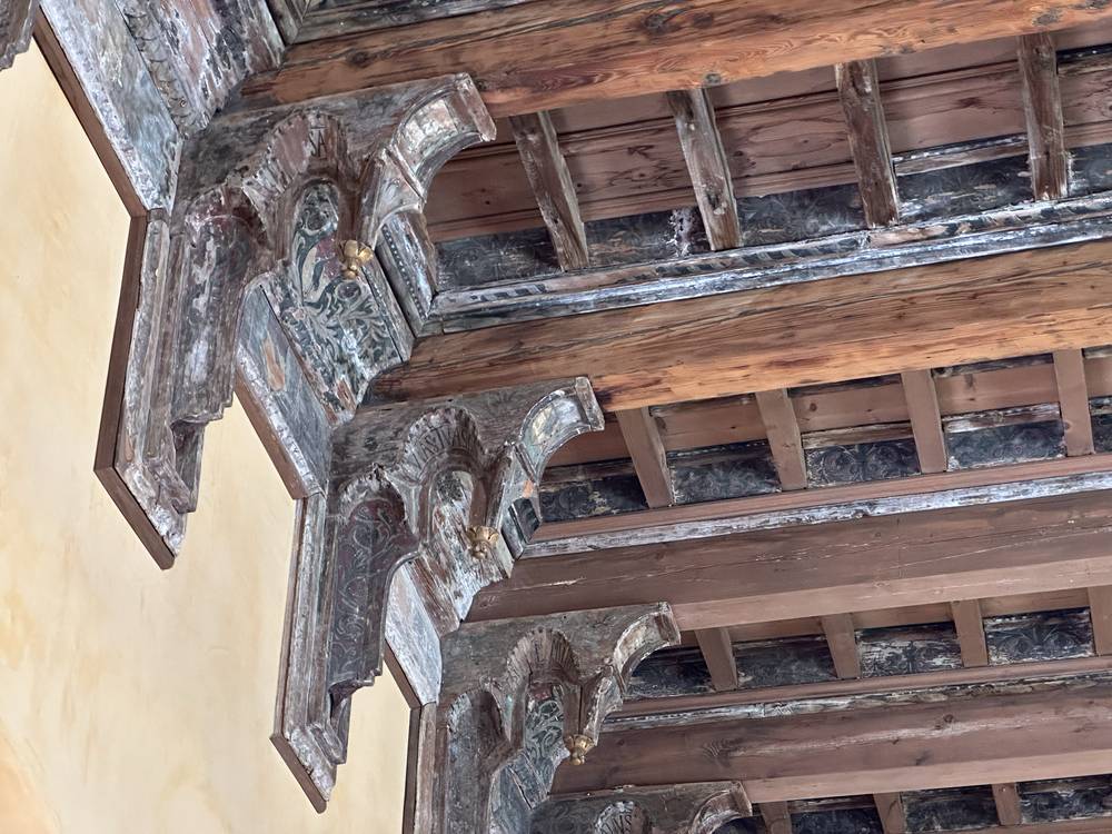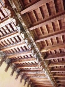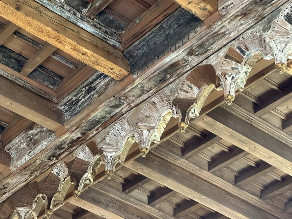 La volta è tutta un ricamo: divisa da due architravi costituiti da fila di cuspidi con elementi penduli intagliati. Il soffitto in legno è a cassettoni.