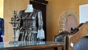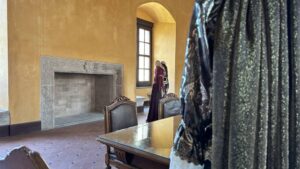 Dalle porte laterali poste a destra dell’ingresso principale del salone delle feste si entra nella stanza cara alla Baronessa di Carini, dove, si narra, avvenissero i suoi presunti incontri con Ludovico Vernagallo.