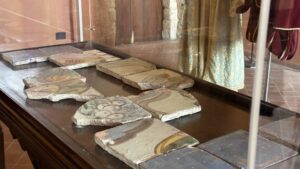 Il pavimento era rivestito di mattonelle di Valenza, andate distrutte a causa del degrado che subì il Castello in seguito all’abbandono da parte della famiglia La Grua Talamanca intorno al 1812.