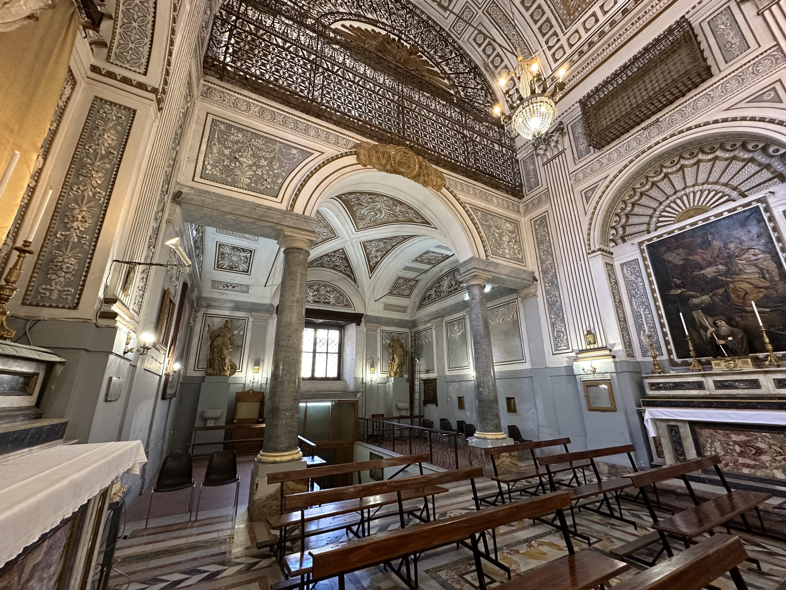 In alto, il matroneo: spazio riservato alle suore, nascosto da una grata.
