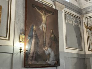 Vicino alla scala trovi un quadro del 1835: la Crocifissione.
